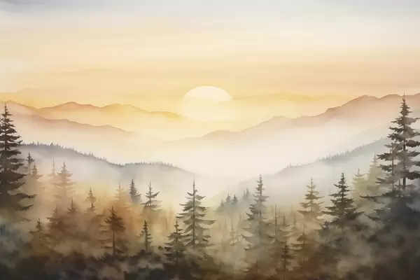 Poster Sügisene mägimaastik, männimets, päikeseloojang, akvarell Nr f41645