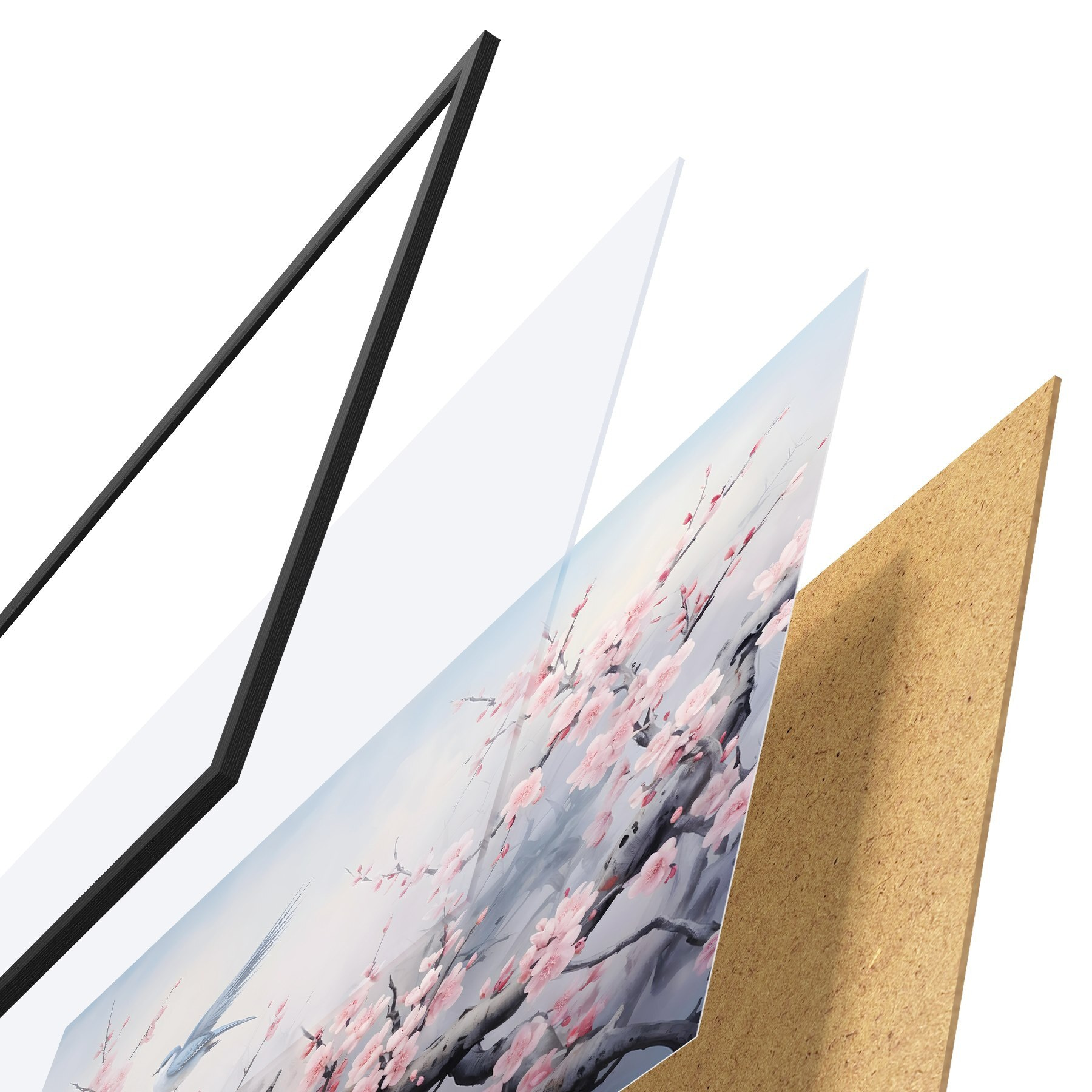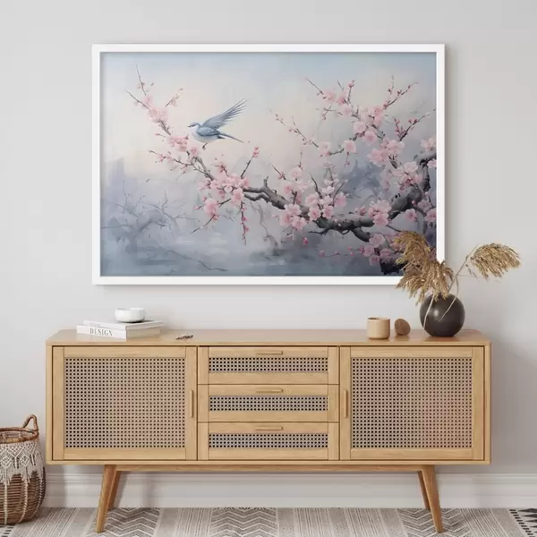 Plakat Sinine lind, kes lendab roosade kirsiõielillede vahel sumedal kevadisel summutatud taustal f41712