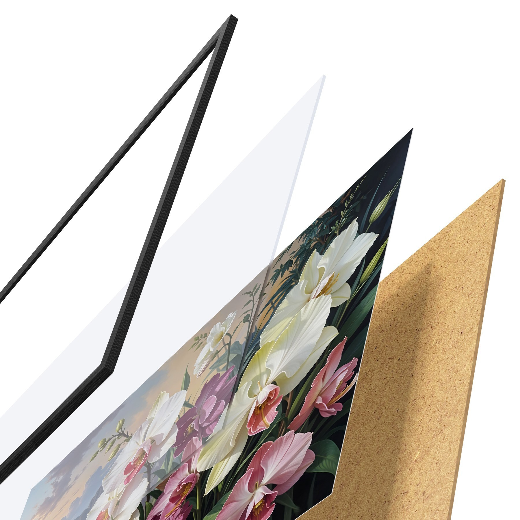 Plakat Elav troopiliste lillede kimp koos orhideede ja lopsakate roheliste lehtedega meremaastiku taustal f41713