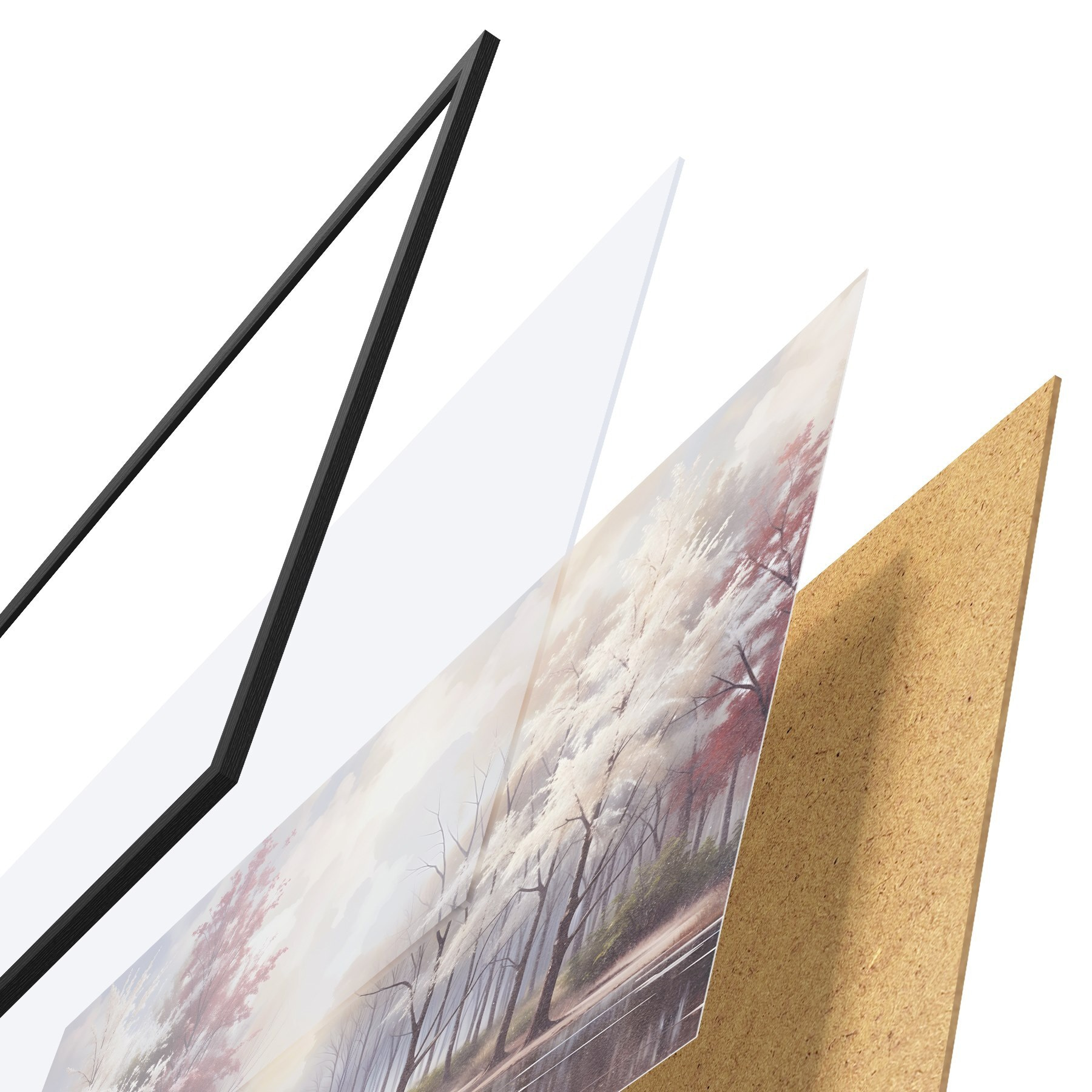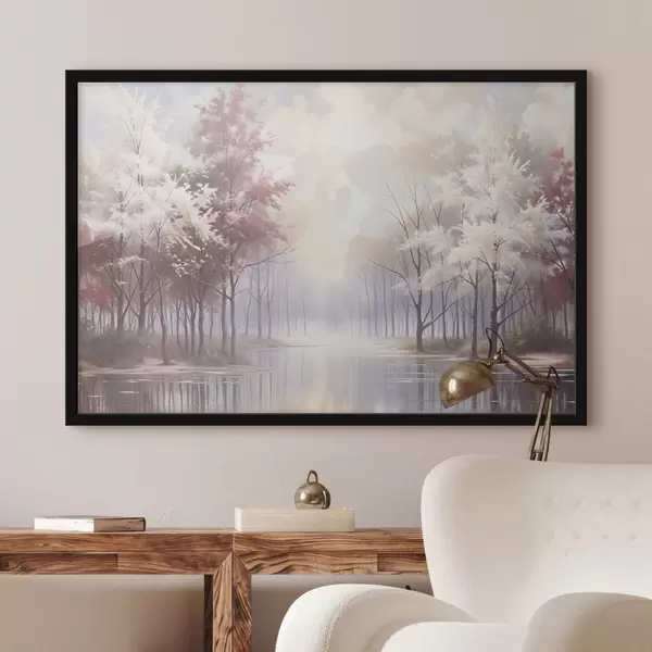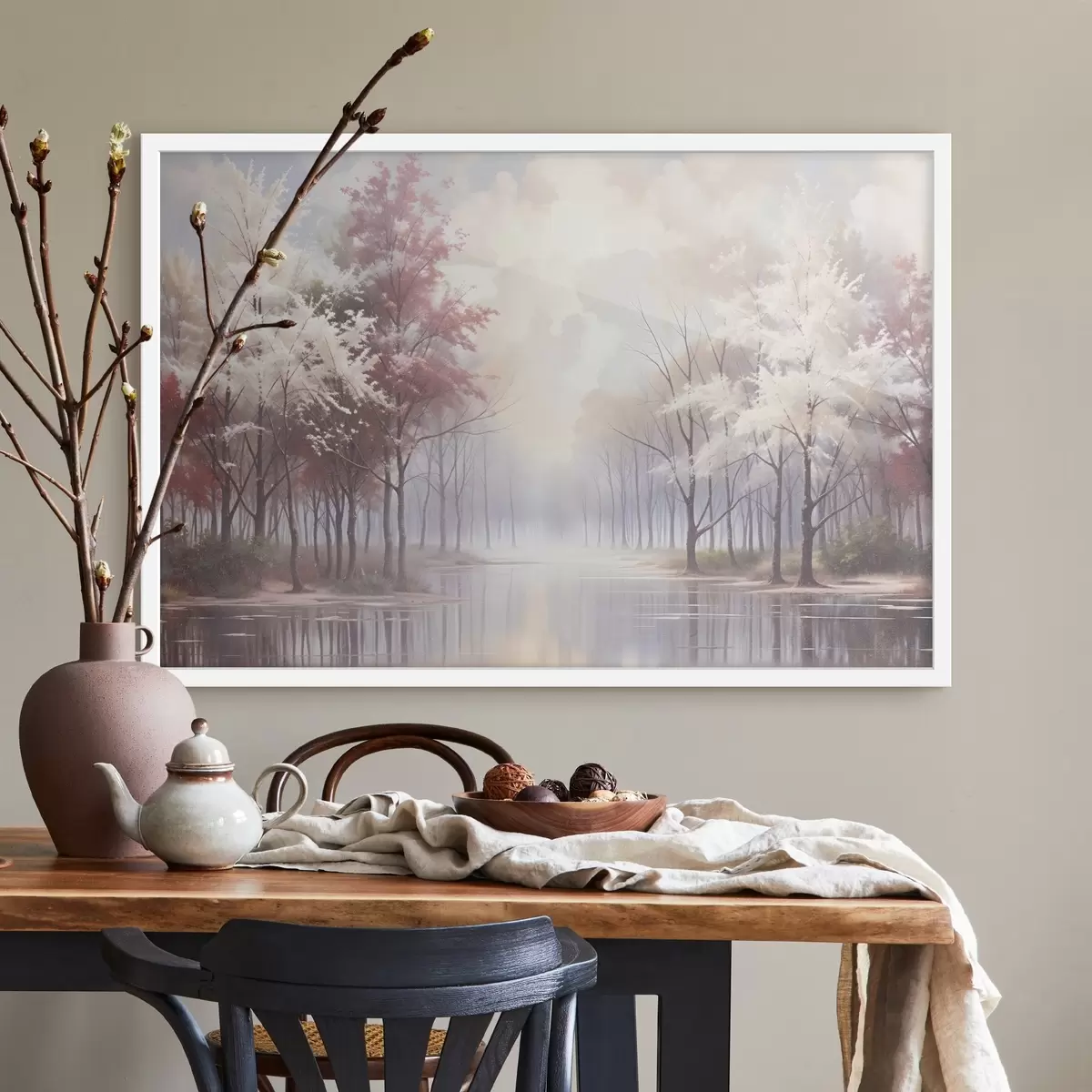 Poster Rahulik maastik uduse metsa, paljaste puude ja rahulik järvega, mis peegeldab pehmeid roosasid ja valgeid toone Nr f41720