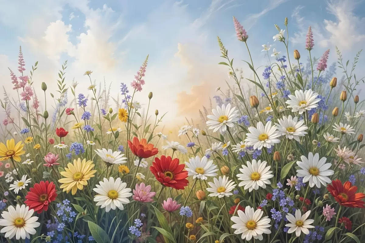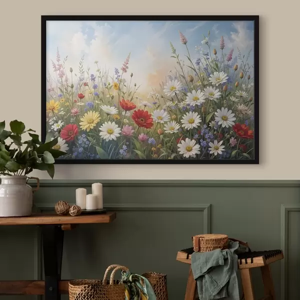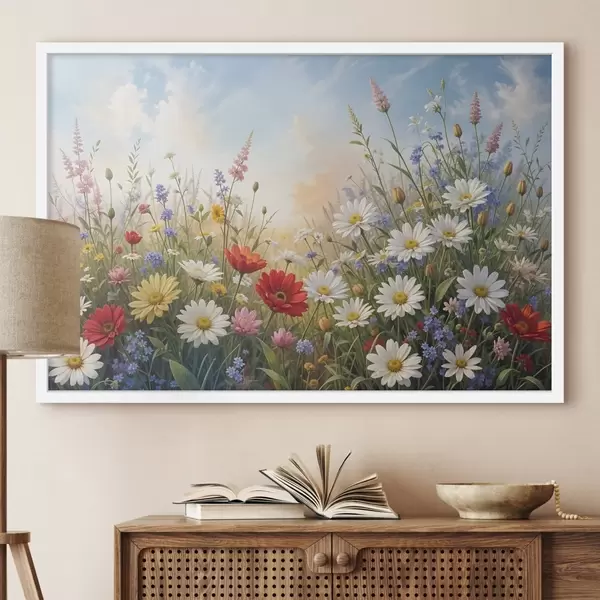Poster Värviliste metsalillede väli, sealhulgas päevalilled, moonid ja muud õitsevad taimed sinise taeva taustal Nr f41725