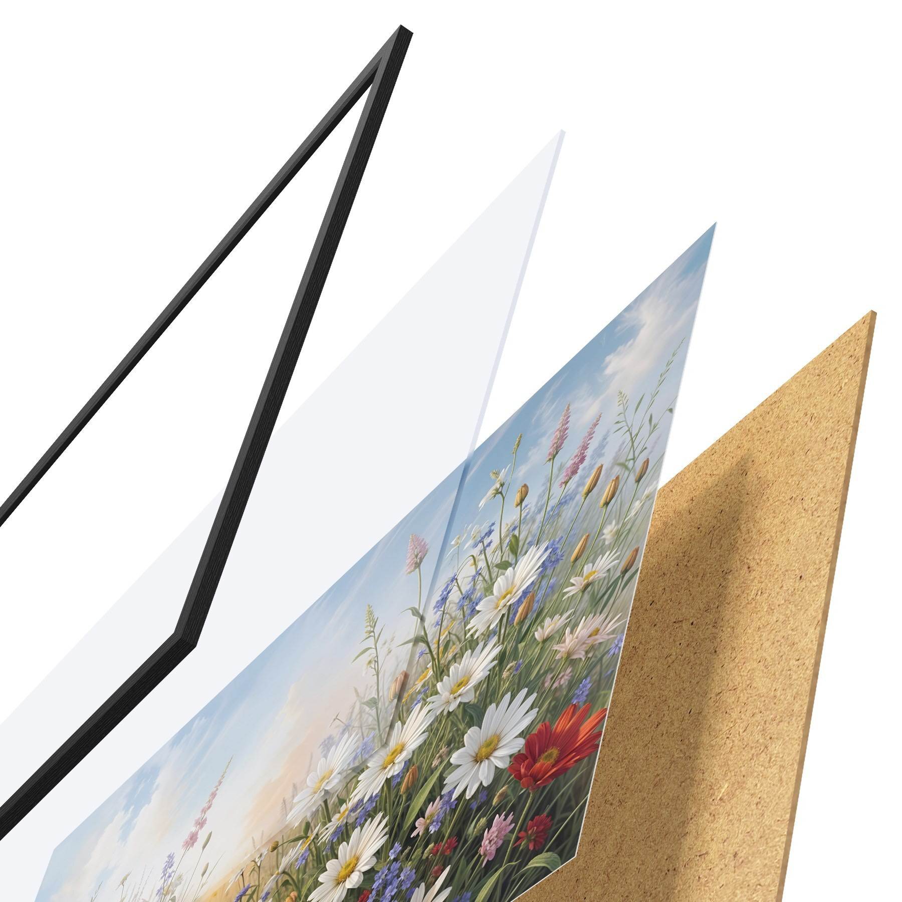 Plakat Värviliste metsalillede väli, sealhulgas päevalilled, moonid ja muud õitsevad taimed sinise taeva taustal f41725