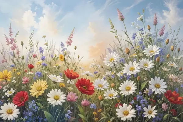 Poster Värviliste metsalillede väli, sealhulgas päevalilled, moonid ja muud õitsevad taimed sinise taeva taustal Nr f41725