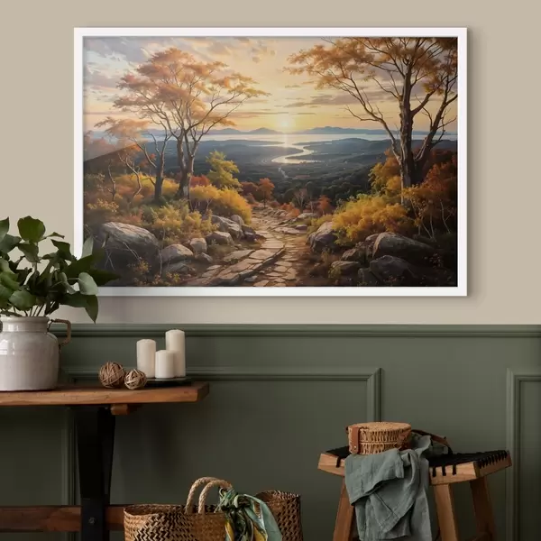 Plakat Maastik, mille looklev mullarada viib läbi sügisvärviliste puude metsa ja päikeseloojangutaeva f41732