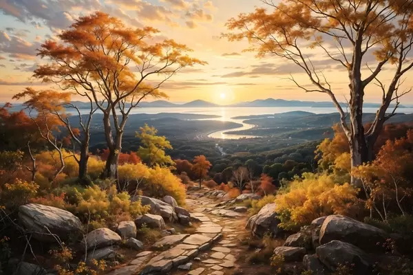 Poster Maastik, mille looklev mullarada viib läbi sügisvärviliste puude metsa ja päikeseloojangutaeva Nr f41732