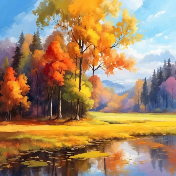 Plakat Järv ja sügisene mets akrüülstiilis f41766