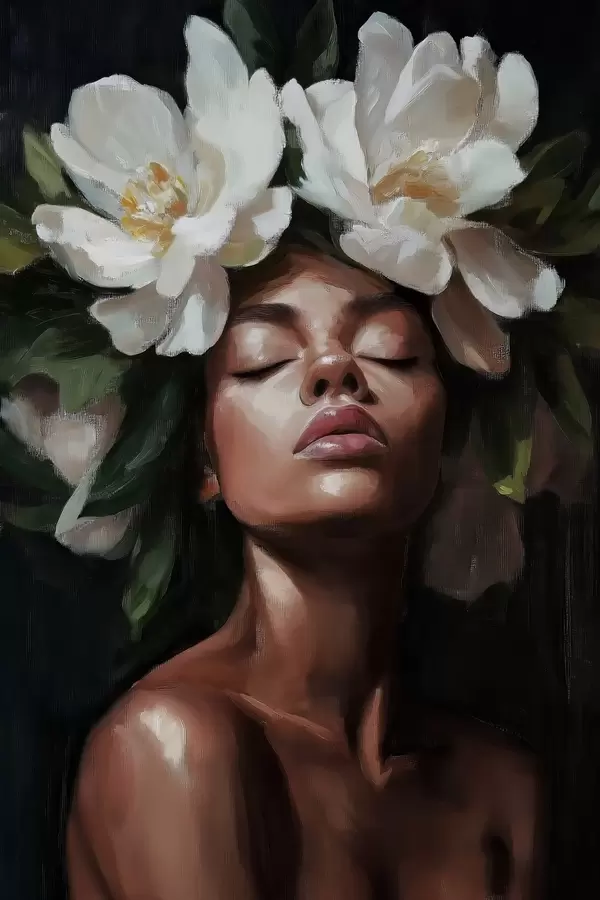 Plakat Naisportree valge lilledega juustes tumedal taustal f41824