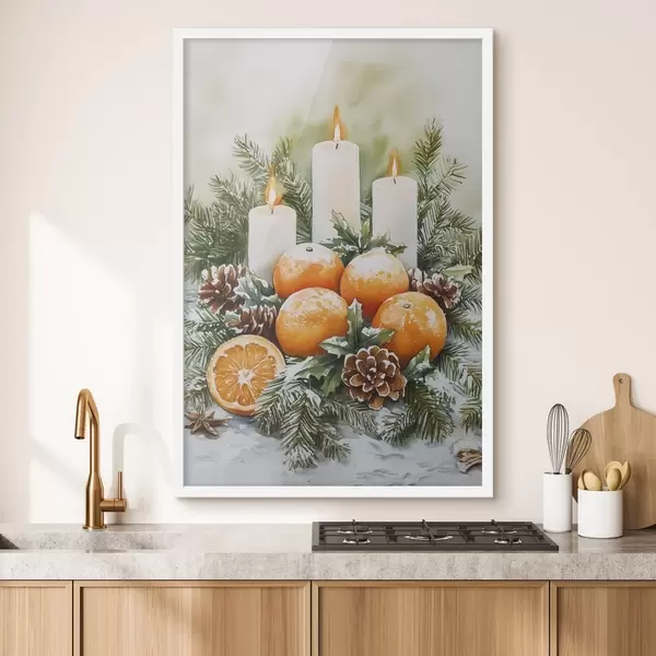 Poster Jõulukaunistus küünalde, männi, käbide ja apelsinidega, akvarellstiilis Nr f41951