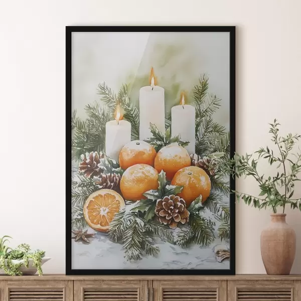 Poster Jõulukaunistus küünalde, männi, käbide ja apelsinidega, akvarellstiilis Nr f41951