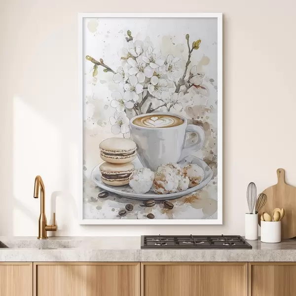 Poster Kaunis tass kohvi, jasmiinililled, makroonid, pehmed akvarellvärvid Nr f41964