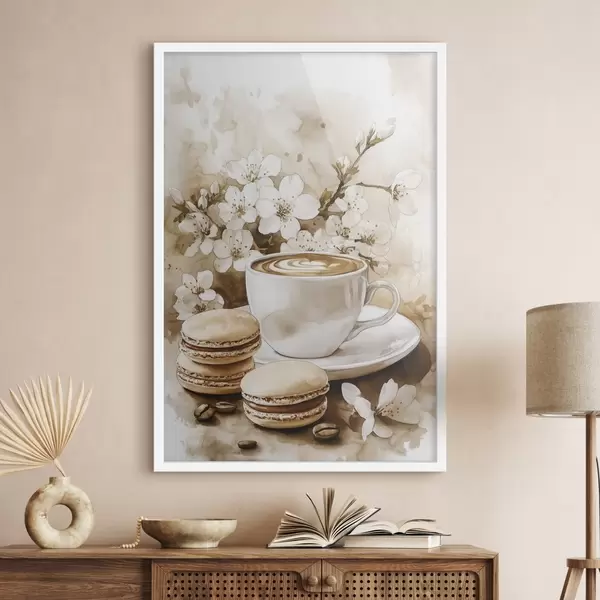 Plakat Makroonid, tass kohvi, akvarellistiil, beežid värvid, jasmiinililled f41965