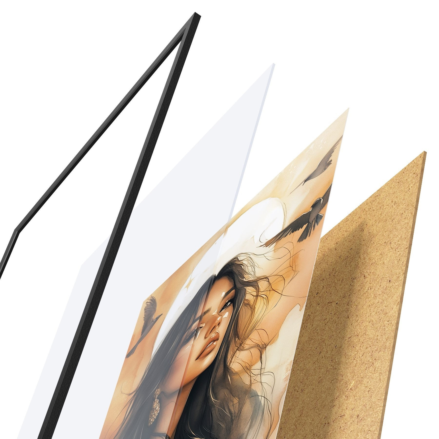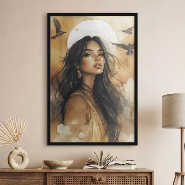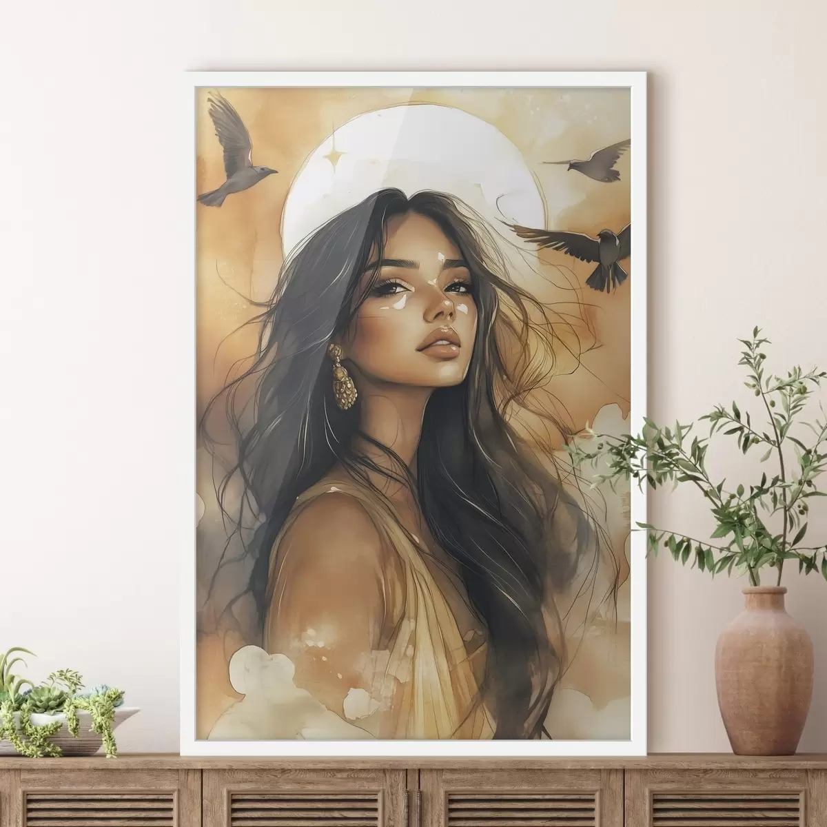 Poster Naine lendavate lindudega, tribal, beežid värvid, päike Nr f42196