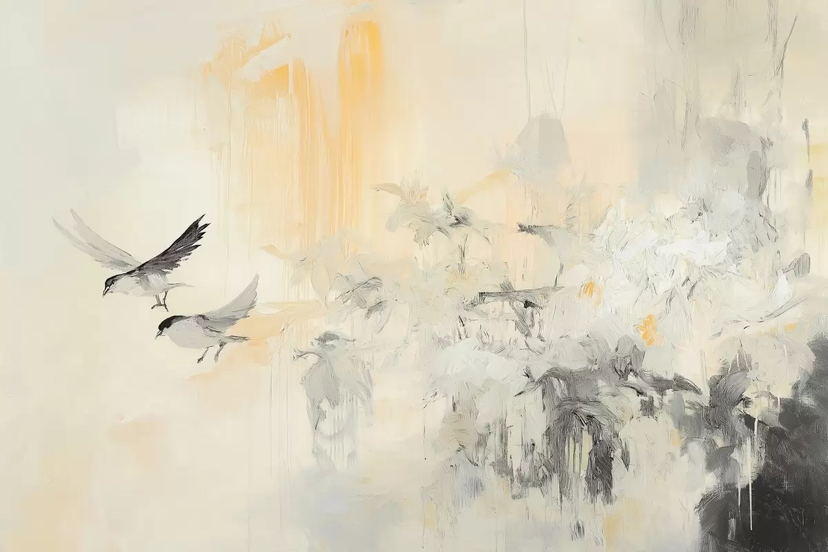 Plakat Abstraktsioon lindudega, akrüülstiilis, hallid ja beežid värvid f42206