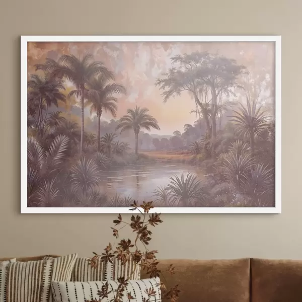 Plakat Troopilise tekstuuriga maastik, kus on rahulik järv, mida ümbritsevad lopsakad palmid ja muud lehestikud f42219