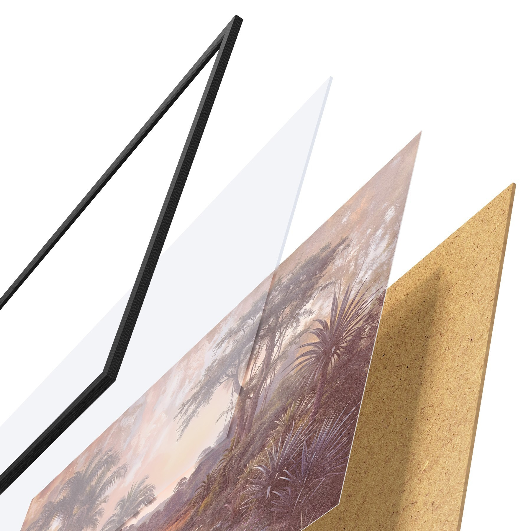 Poster Troopilise tekstuuriga maastik, kus on rahulik järv, mida ümbritsevad lopsakad palmid ja muud lehestikud Nr f42219