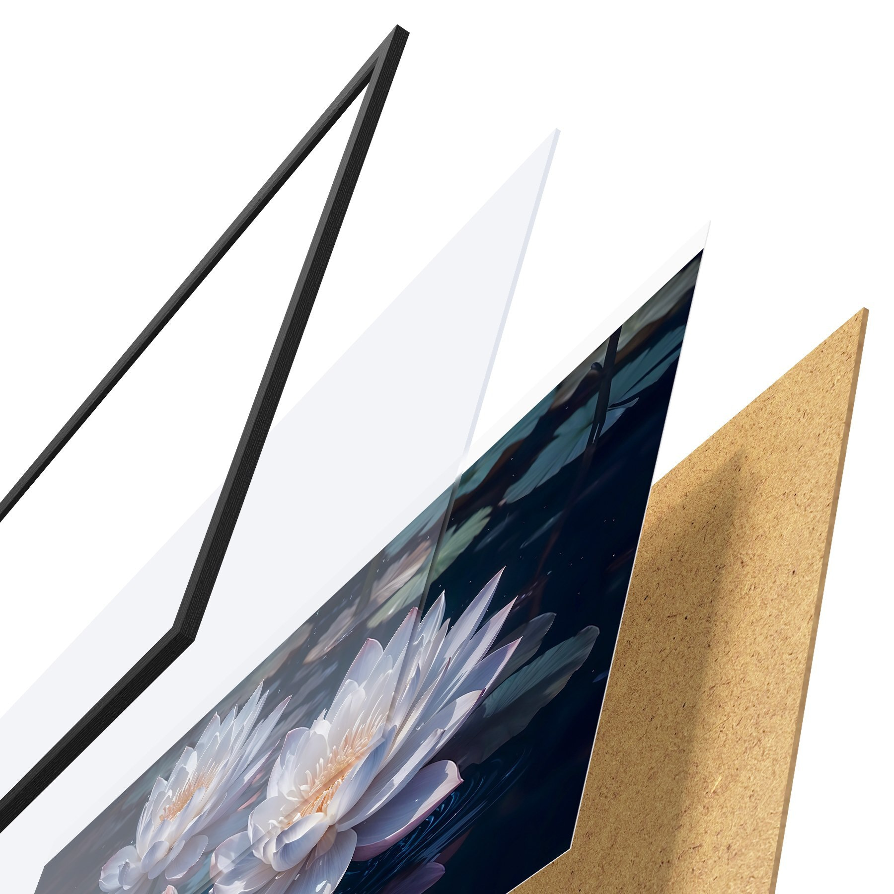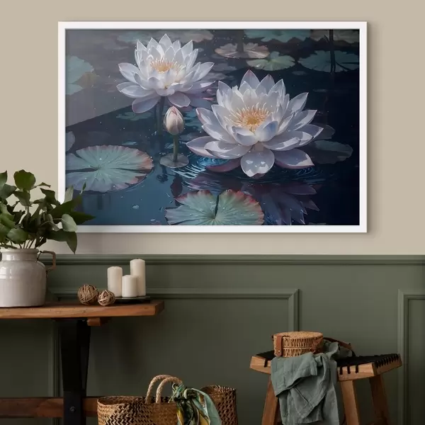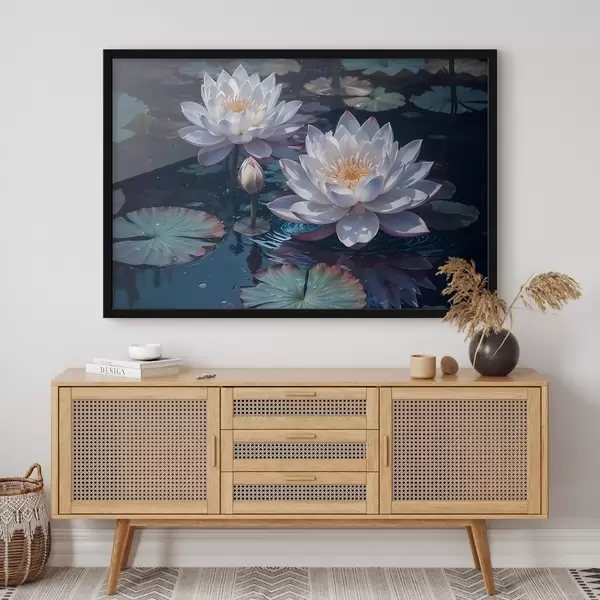 Plakat Valged lootoslilled hõljuvad rahulikul tiigil koos lillelilledega f42225