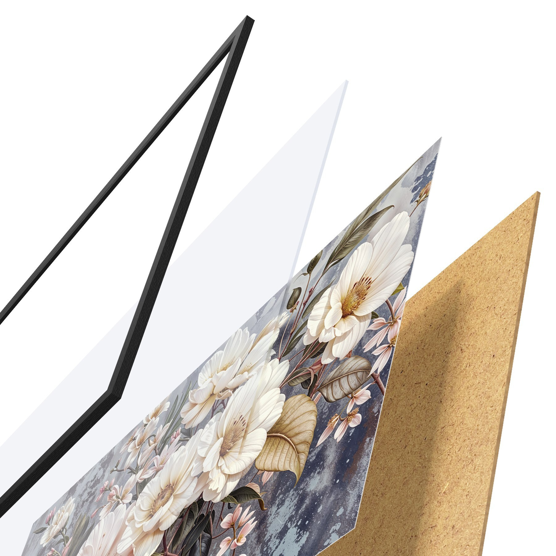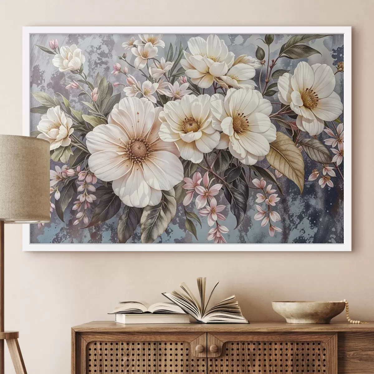 Poster Elavat värvi kimp suurte üksikasjalike valgete ja roosade daaliaõitega roheliste lehtedega tumedal taustal Nr f42227