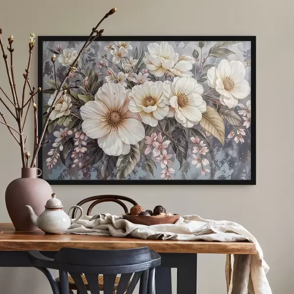 Plakat Elavat värvi kimp suurte üksikasjalike valgete ja roosade daaliaõitega roheliste lehtedega tumedal taustal f42227