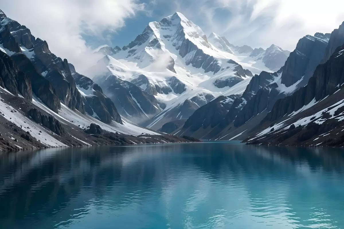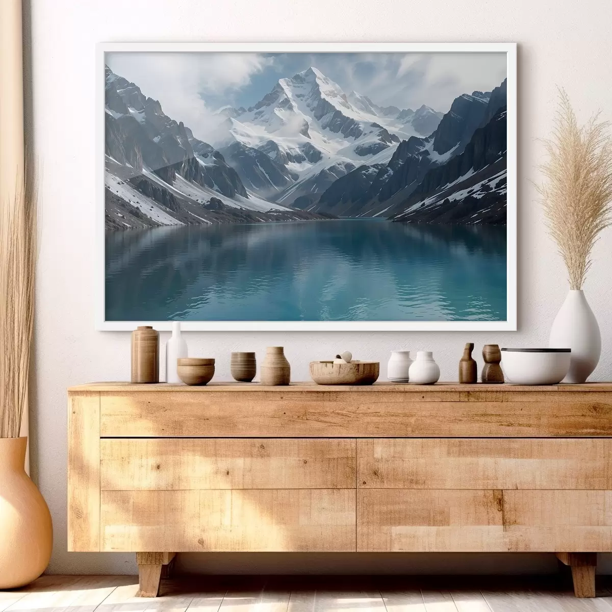 Poster Lumekattega mäetipus, mis peegeldub rahulikus türkiissinises järves, mida ümbritsevad kaljune maastik ja dramaatilised pilved Nr f42232
