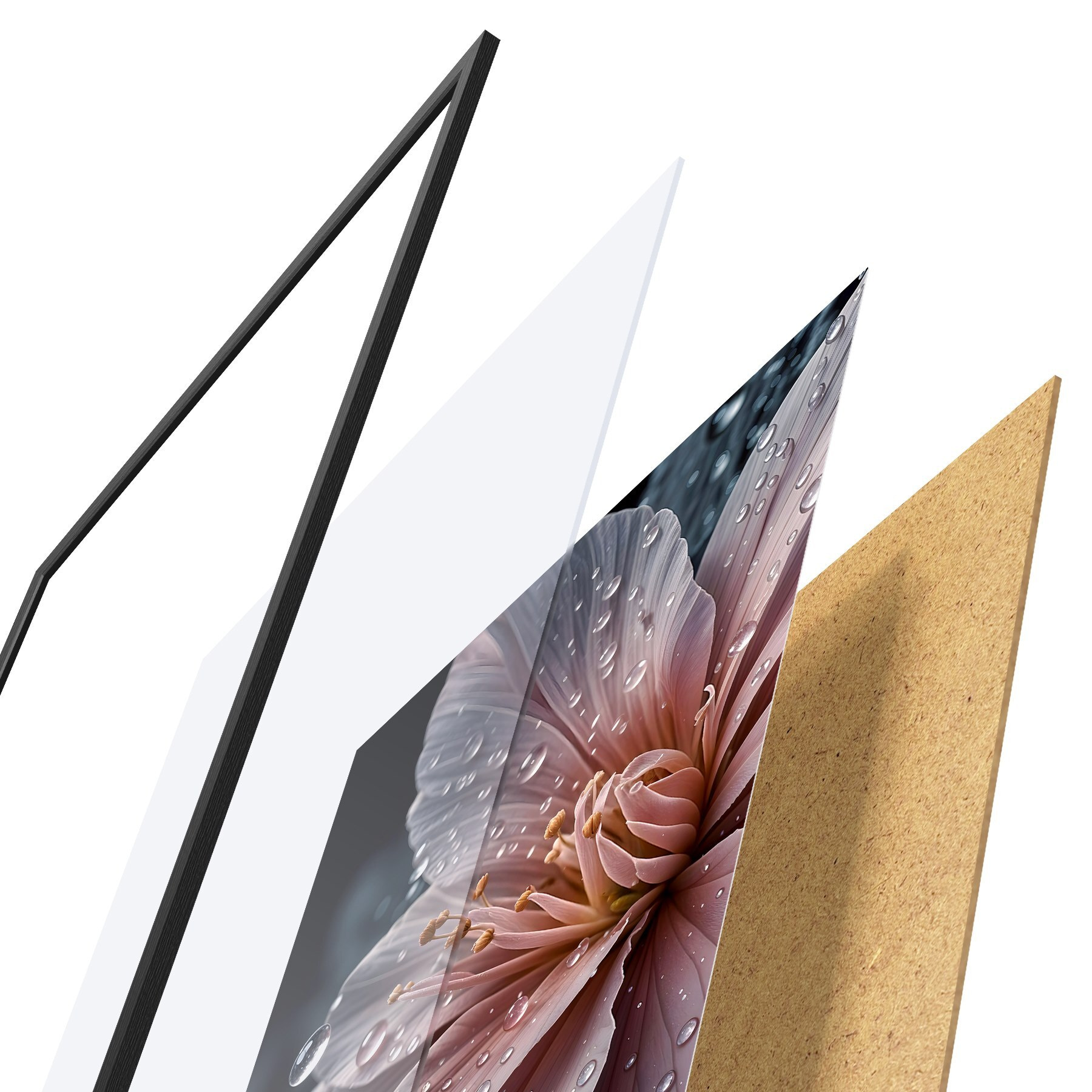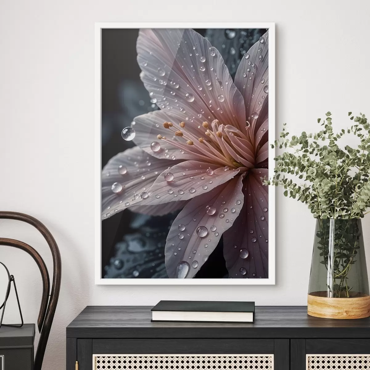 Poster Lähivõtte roosast lillest, mille õrnad kroonlehed on kaetud veepiiskadega, tumedal taustal Nr f42237