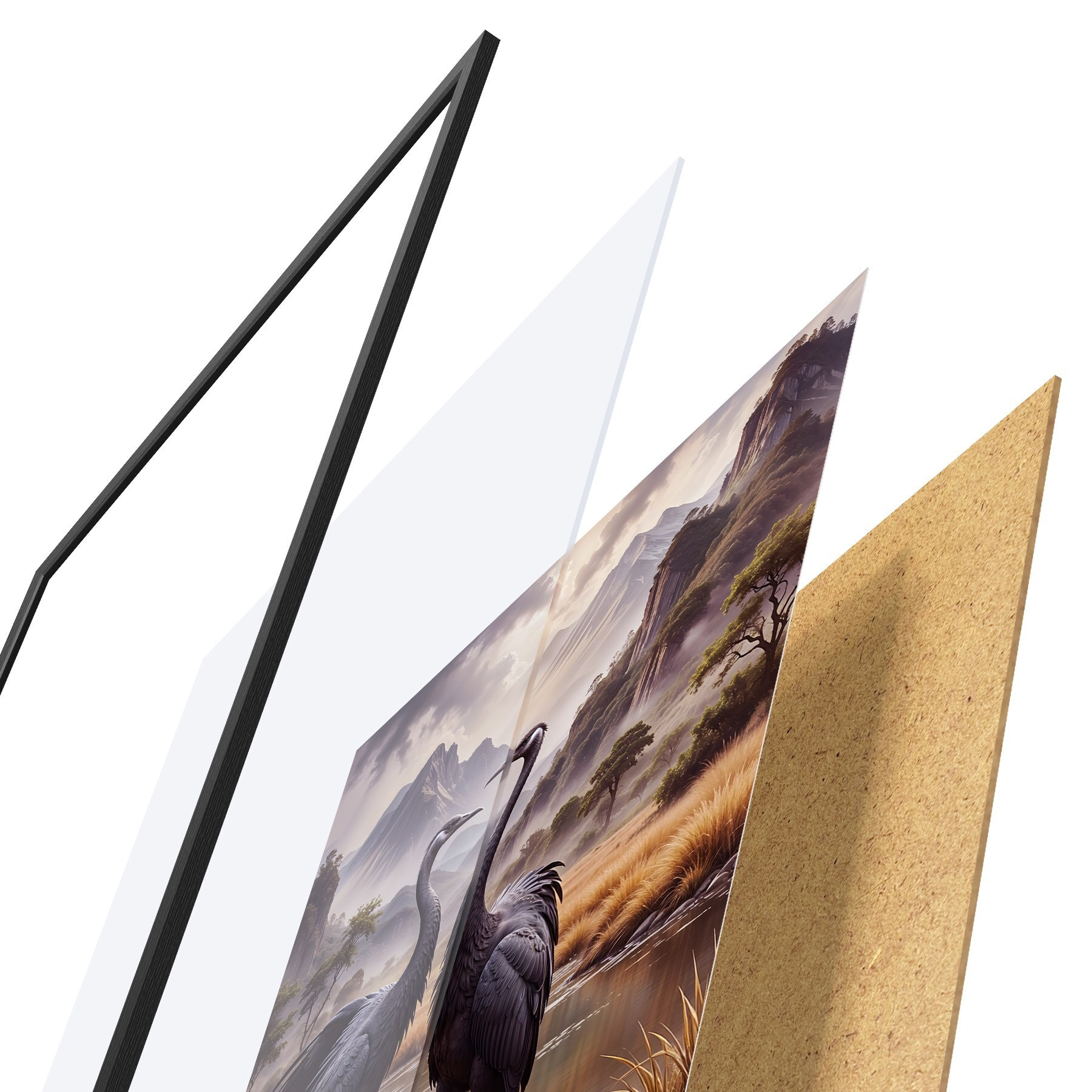 Poster Kaks suurt musta kurge seisavad madalas tiigis, taustaks mägine maastik Nr f42240