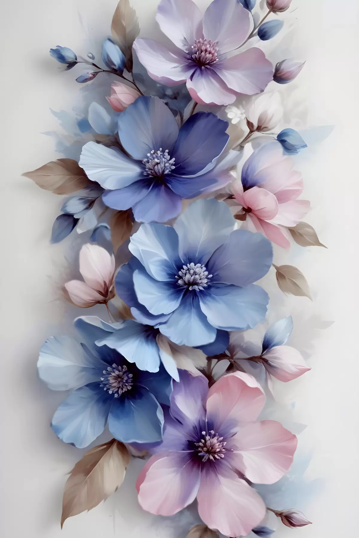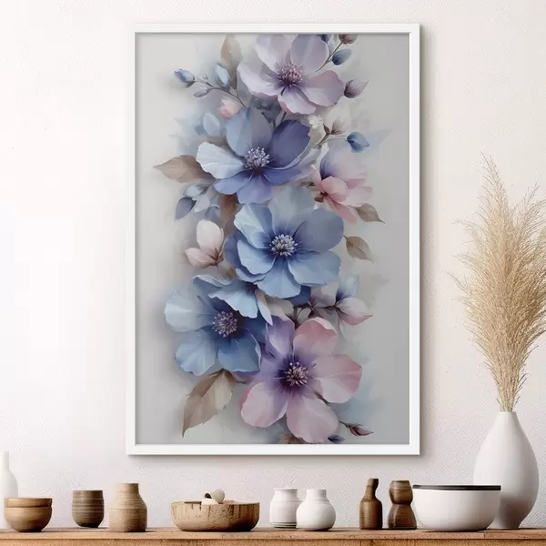 Poster Õrnad sinised ja roosad õrnade kroonlehtede ja keskosaga lilled, mis on paigutatud kaunisse lilleprinti heledal taustal Nr f42241