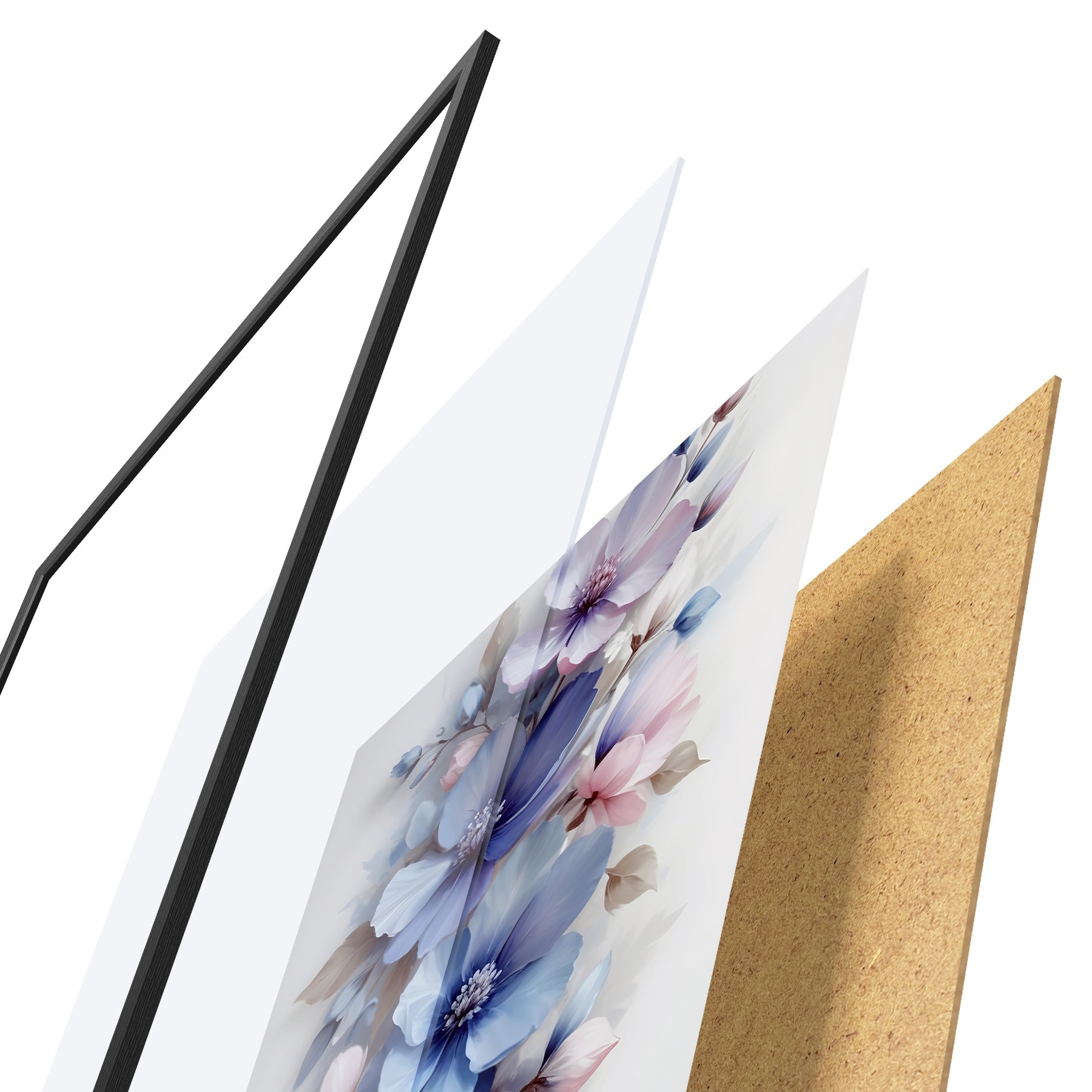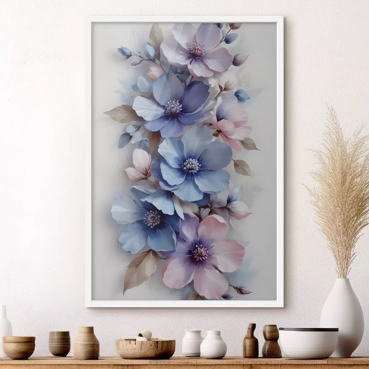 Plakat Õrnad sinised ja roosad õrnade kroonlehtede ja keskosaga lilled, mis on paigutatud kaunisse lilleprinti heledal taustal f42241