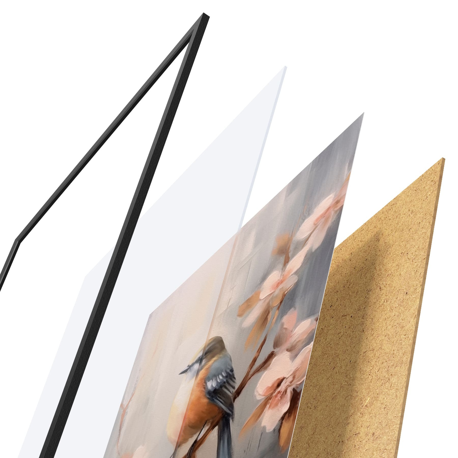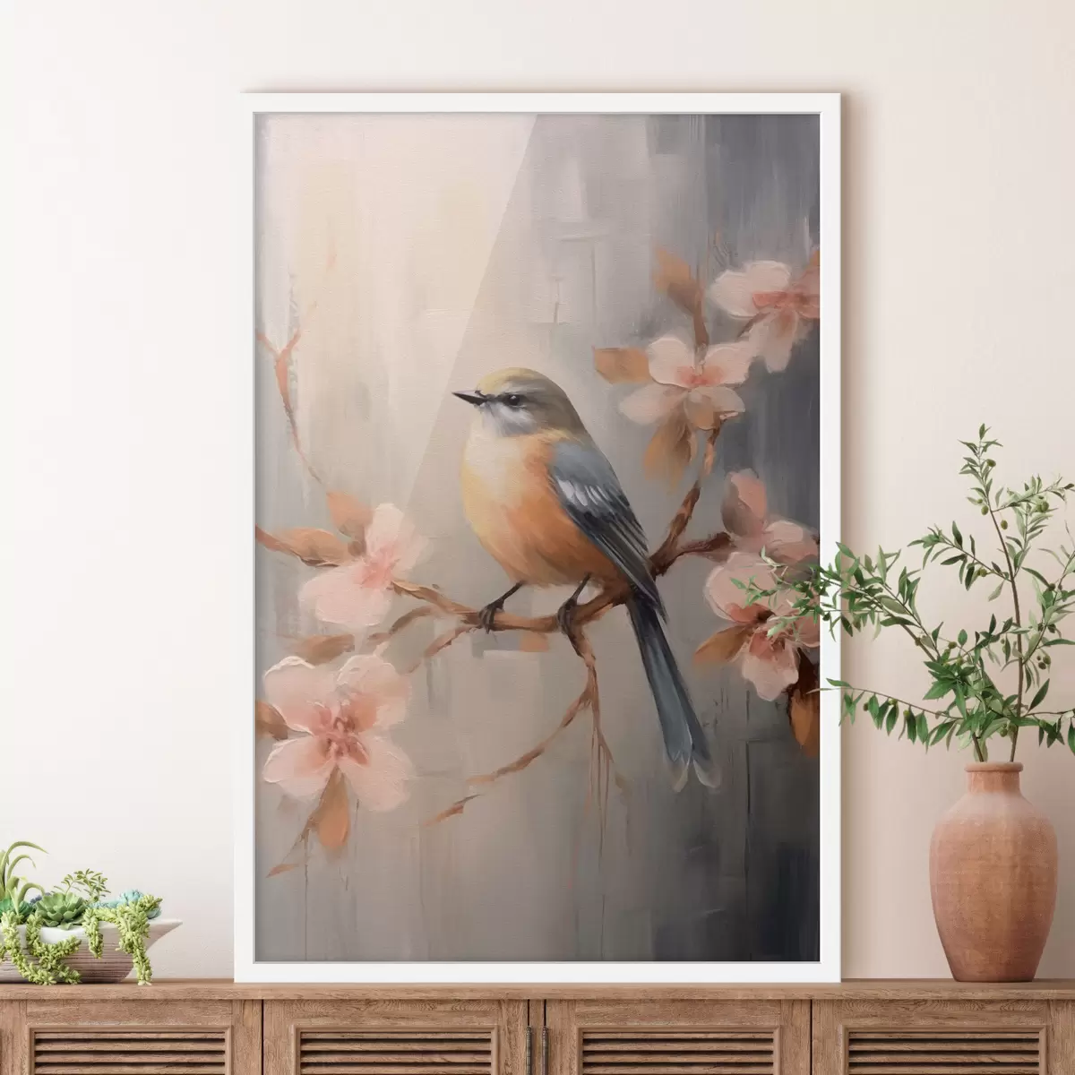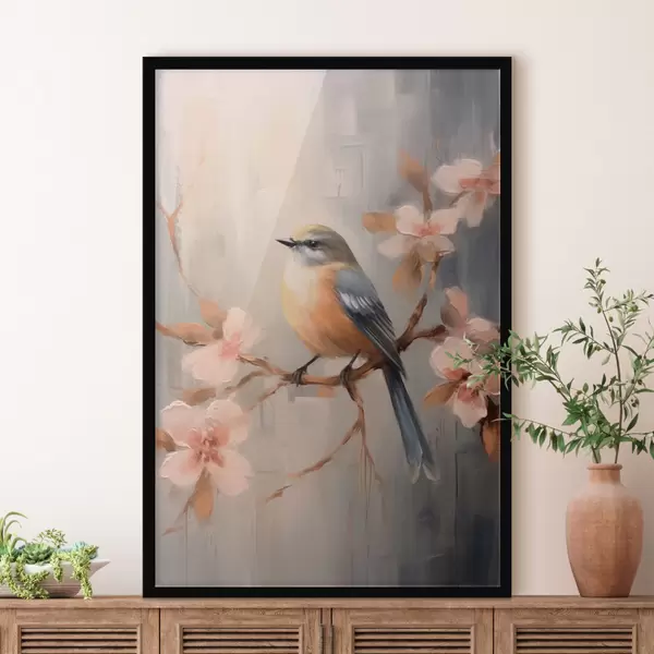 Poster Linnuke oksal ja roosad lilled Nr f42302