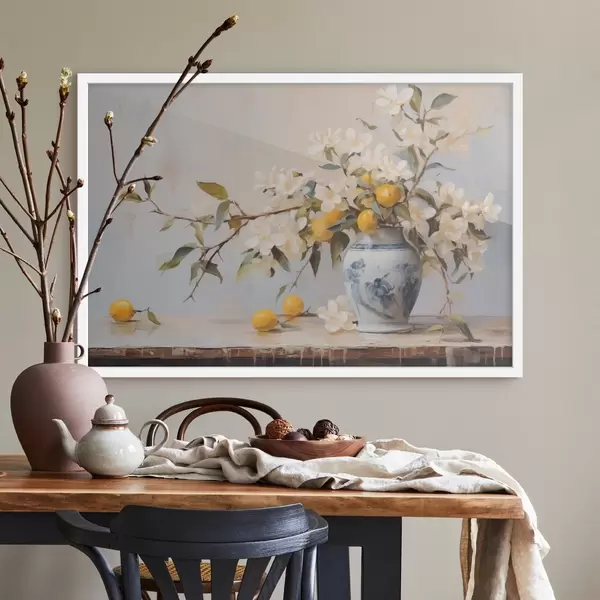 Plakat Vasi valgete lillede okstega ja sidruni imitatsiooniga maaliga f42360