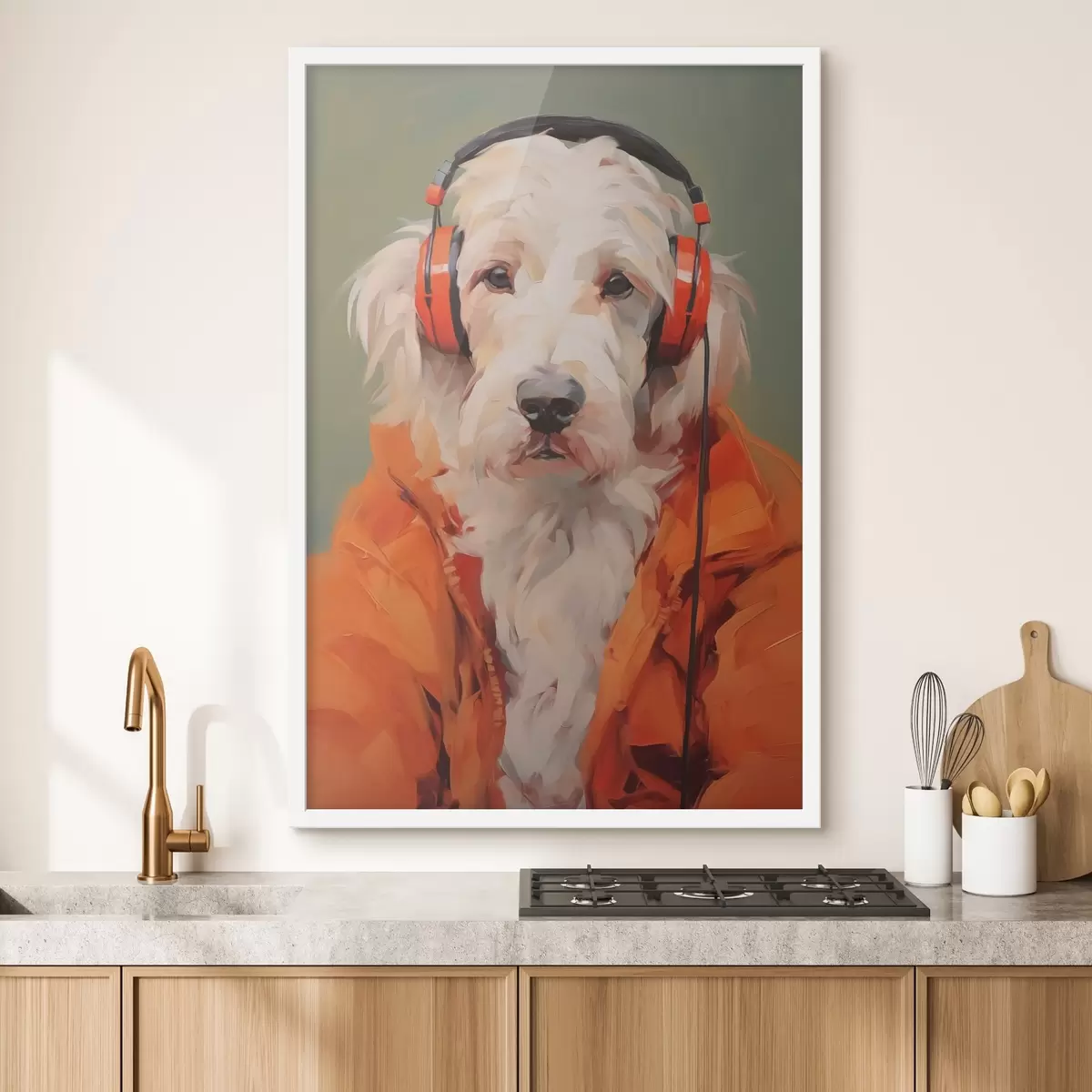 Poster Valge koer oranži jope ja kõrvaklappide imitatsioonimaaliaga Nr f42364