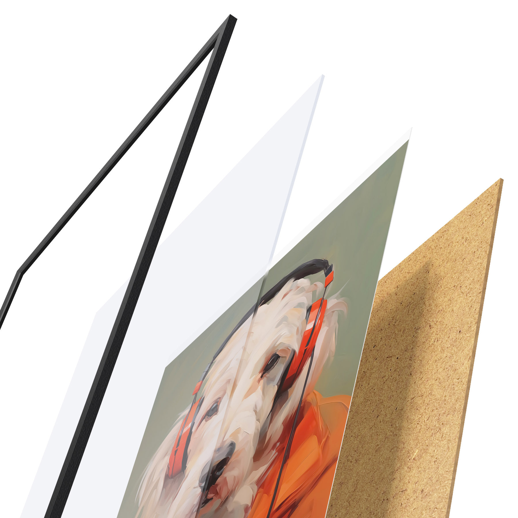 Plakat Valge koer oranži jope ja kõrvaklappide imitatsioonimaaliaga f42364