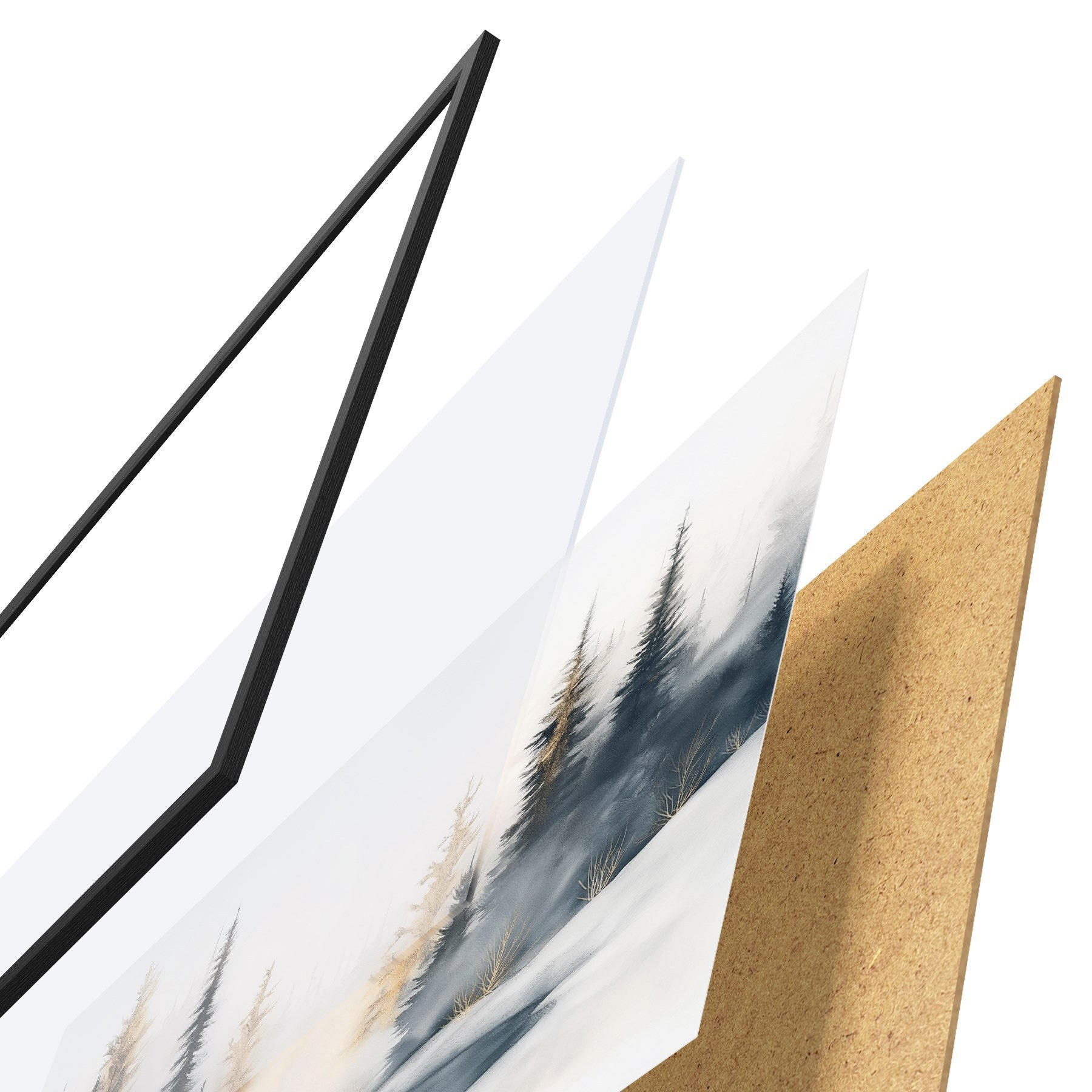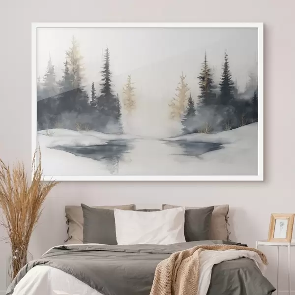 Plakat Talvine maastik jõe ja männipuudega, loodus, mets, udu f42374