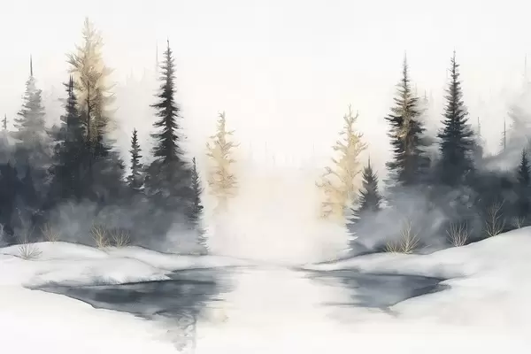 Poster Talvine maastik jõe ja männipuudega, loodus, mets, udu Nr f42374