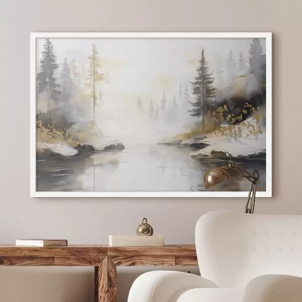 Poster Loodusmaastik jõe, metsa ja mändidega, pehmed pastellvärvid Nr f42375