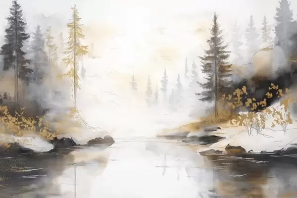 Poster Loodusmaastik jõe, metsa ja mändidega, pehmed pastellvärvid Nr f42375