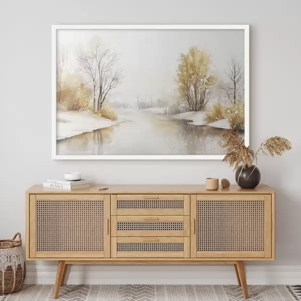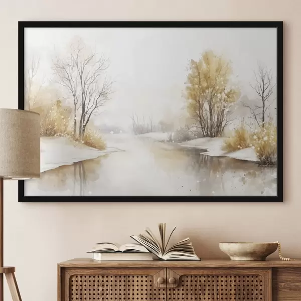 Poster Talvine maastik, jõgi ja puud, akvarellstiilis, beežid värvid Nr f42376