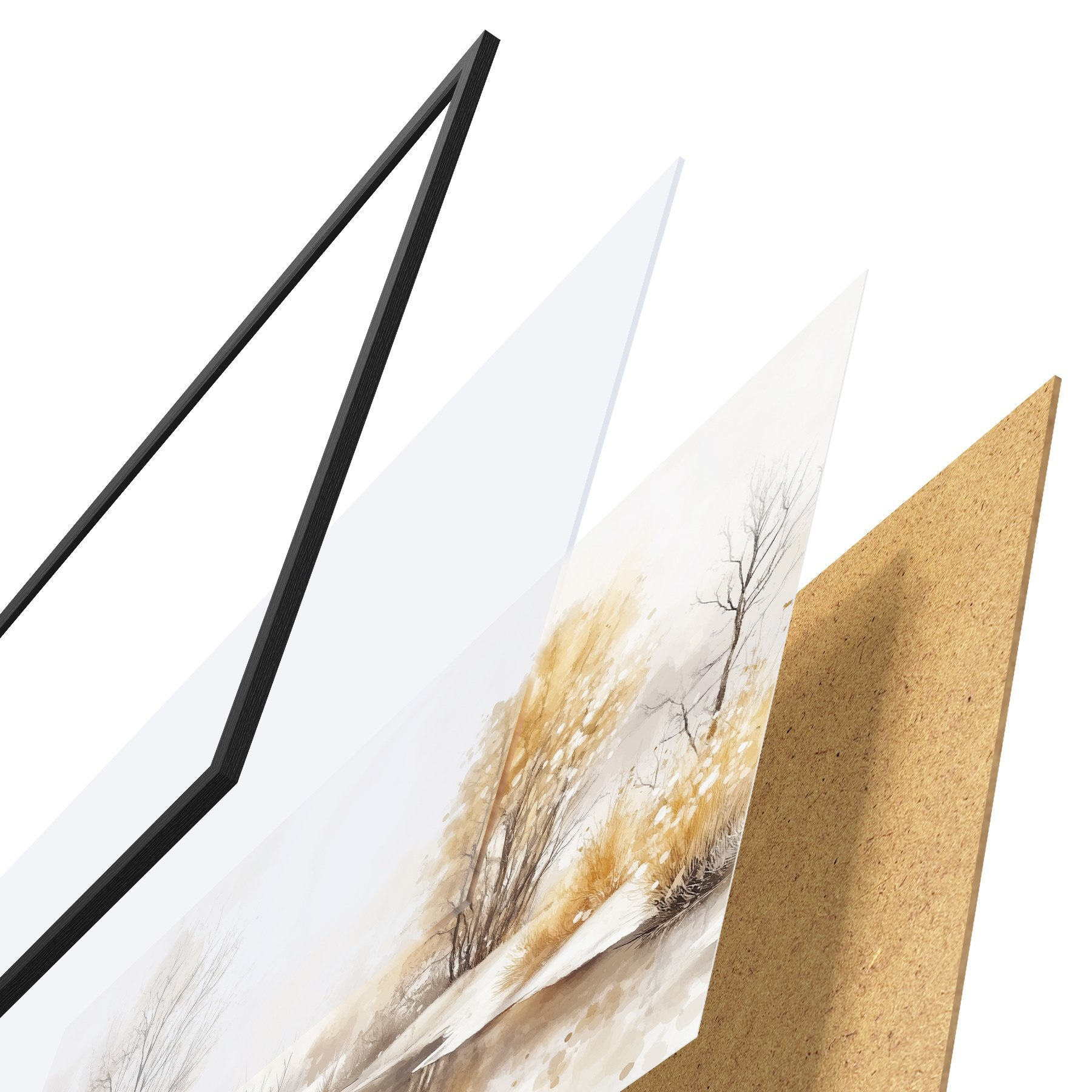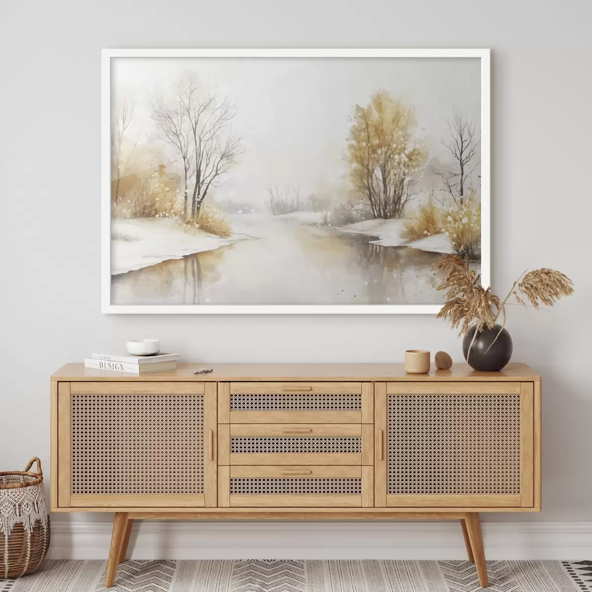 Plakat Talvine maastik, jõgi ja puud, akvarellstiilis, beežid värvid f42376