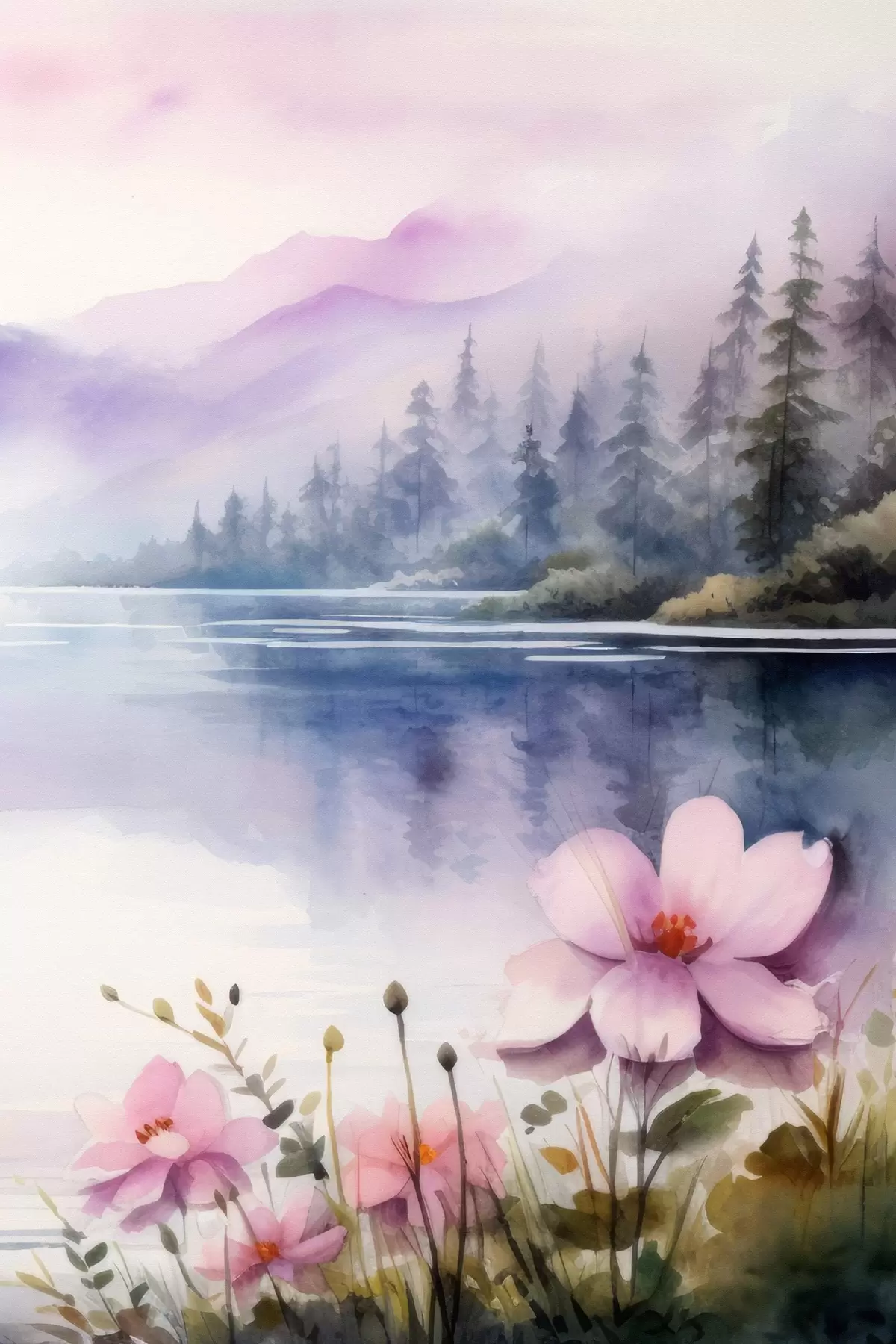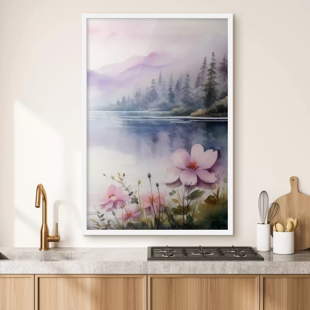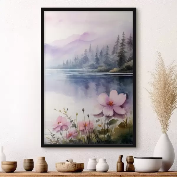 Plakat Roosad lilled mägedes asuva järve taustal f42393