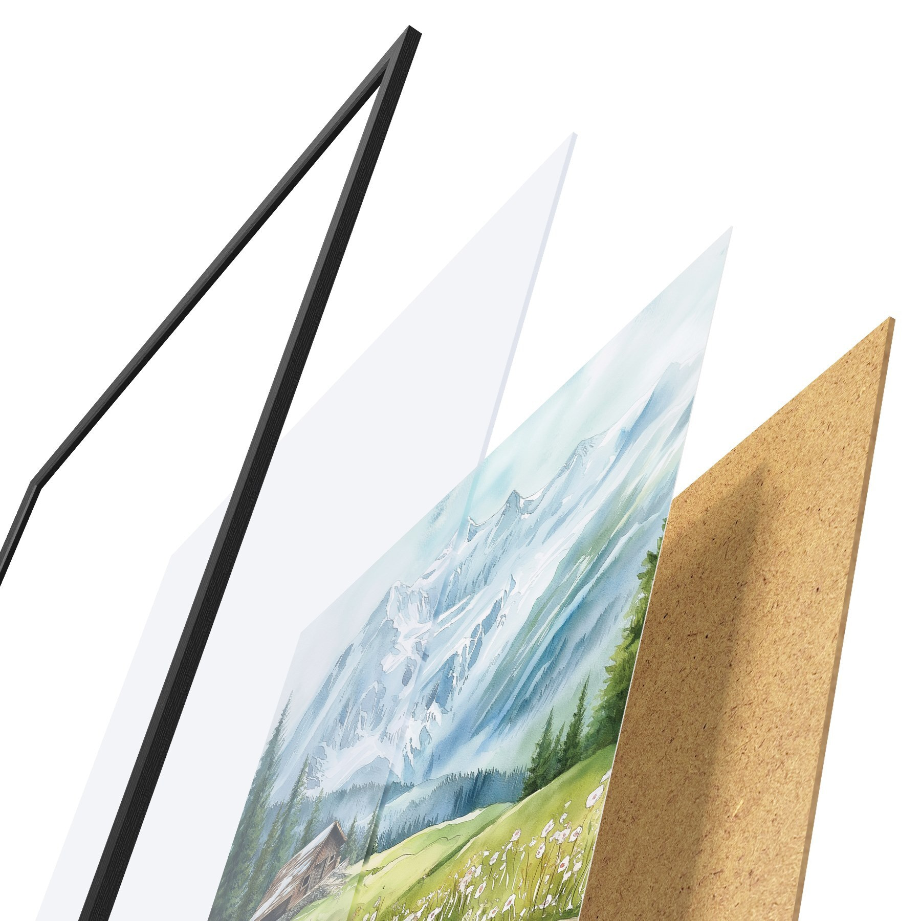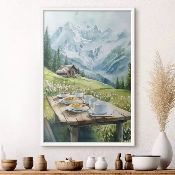 Plakat Hommikusöök Alpides, mäed, mets, loodus, suvi, akvarellstiil f42426