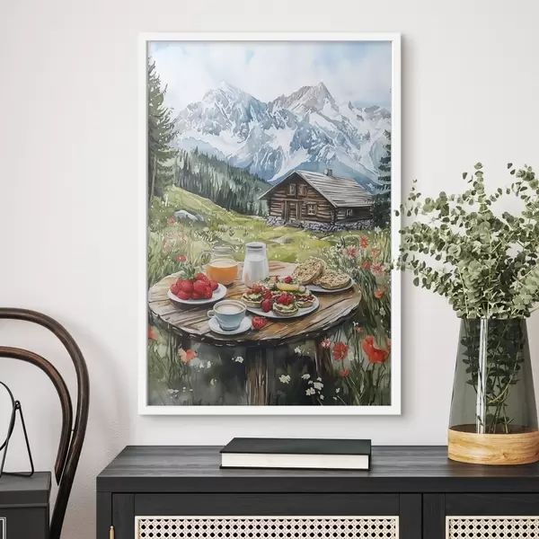 Plakat Ilusad suvised maastikud koos mägede, metsa ja lilledega, hommikusöök, akvarellstiilis f42427