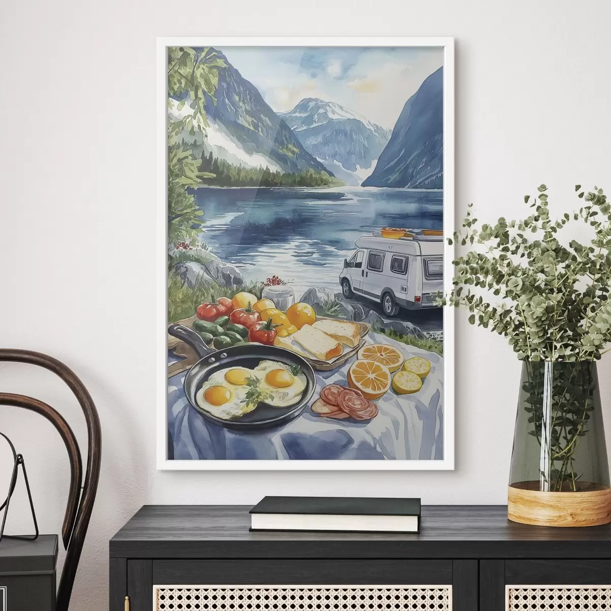 Plakat Reisimine, õues elamine, akvarellistiil, Norra, hommikusöök f42430