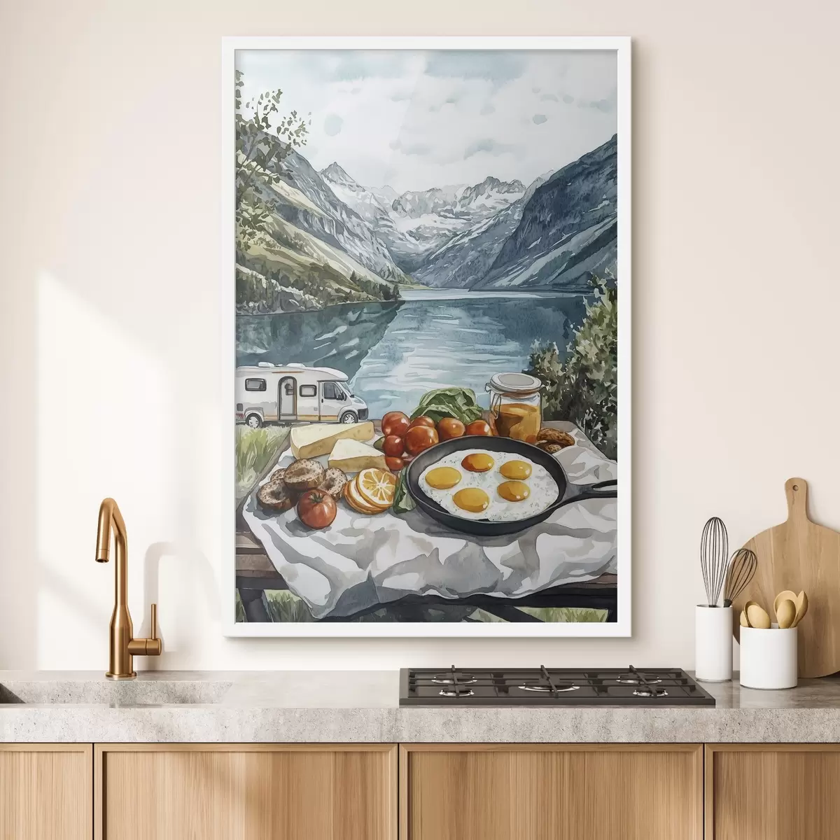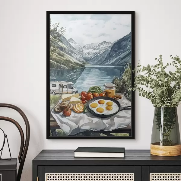 Plakat Reisimine, loodusmaastikud, akvarellistiil, Norra, hommikusöök, kaubikauto f42431