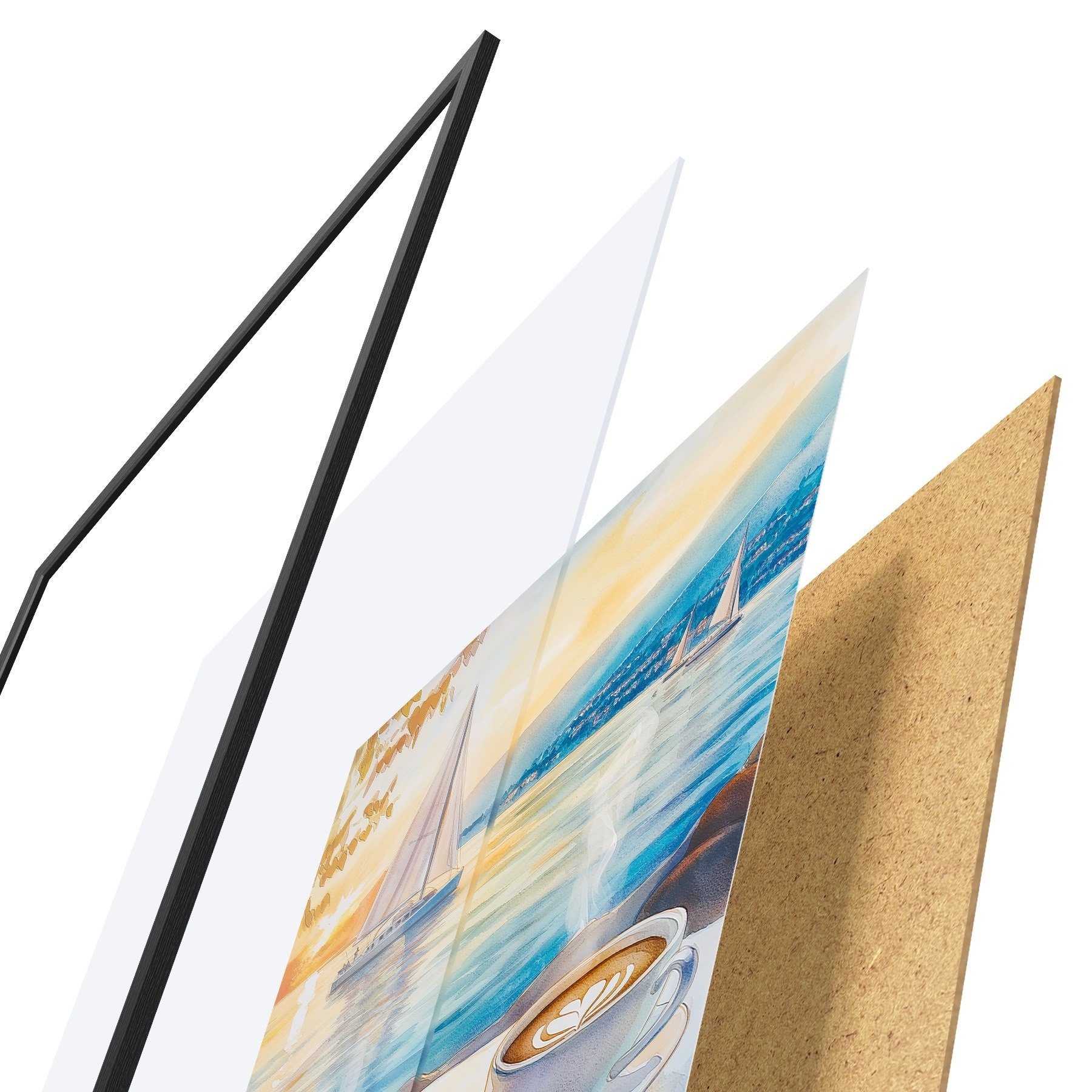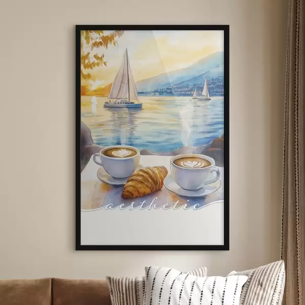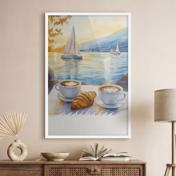 Plakat Kaks tassi cappuccino, akvarellstiilis, mere päikeseloojang, purjekad, kutsumus f42438
