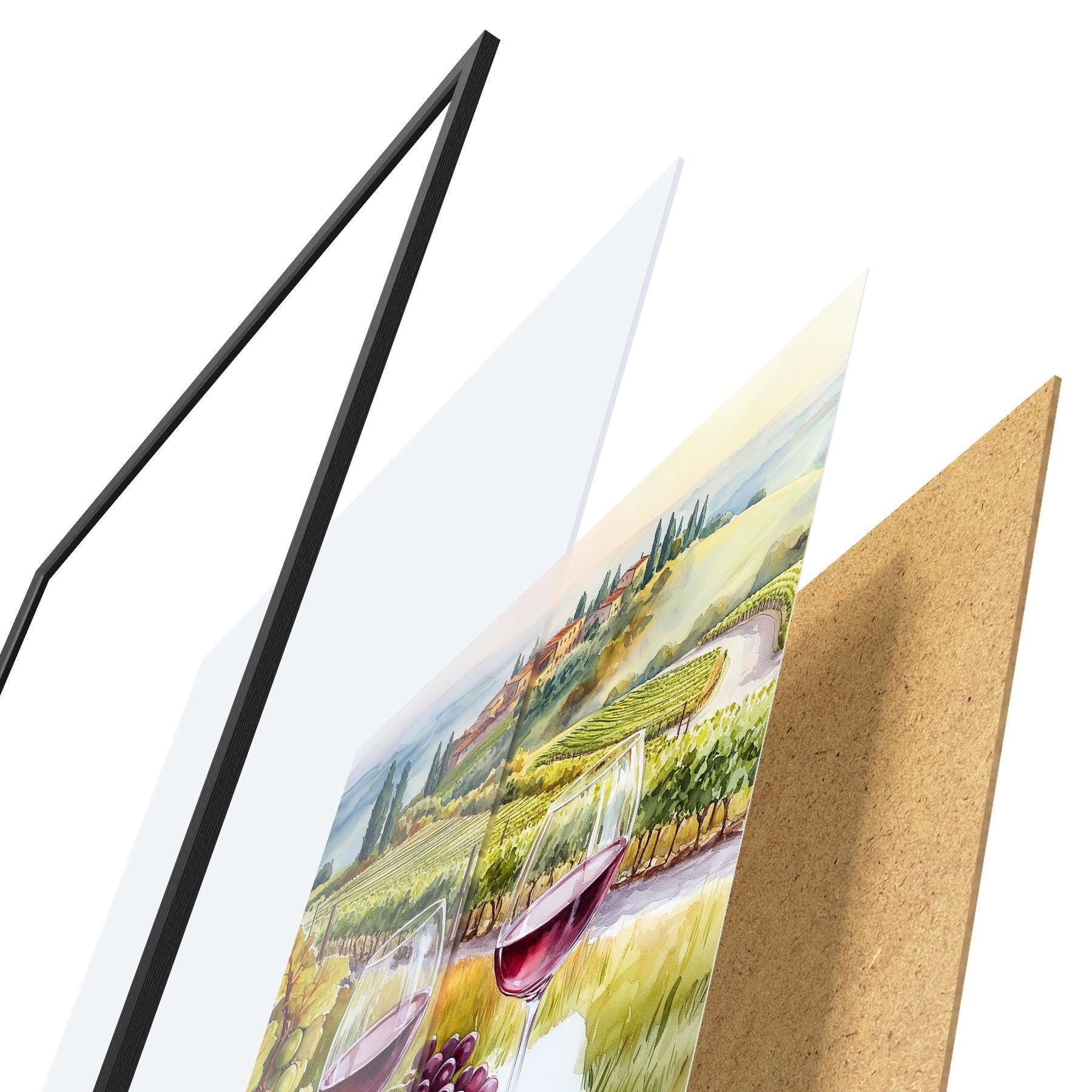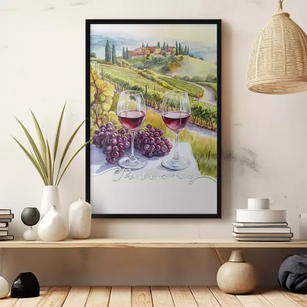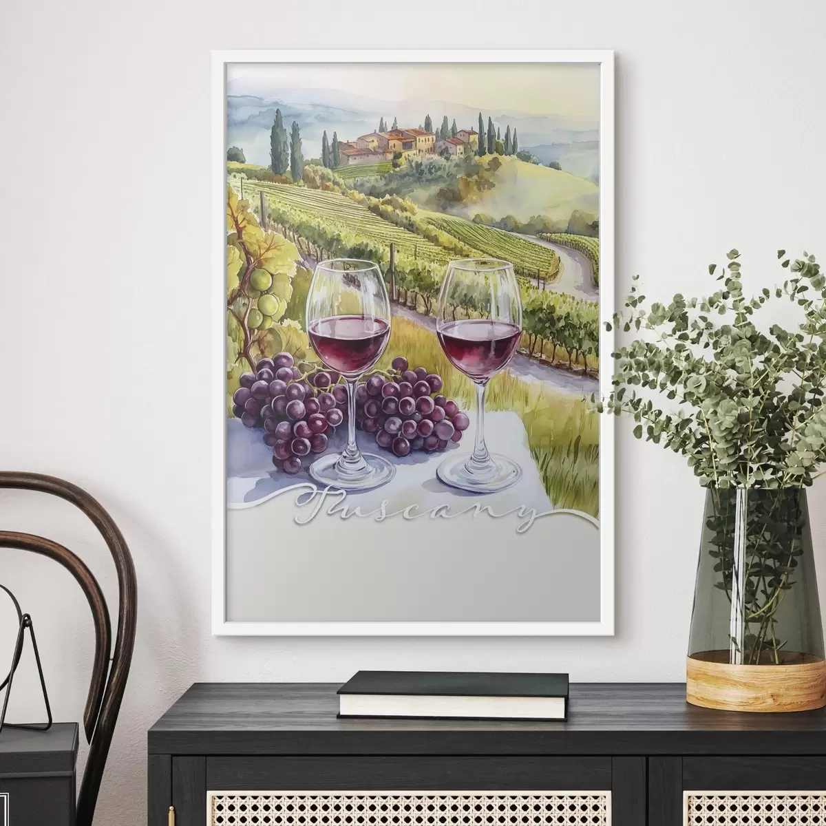 Poster Toscana maastikud, akvarellistiil, veiniklaasid, viinamarjad, päikeseloojang Nr f42439