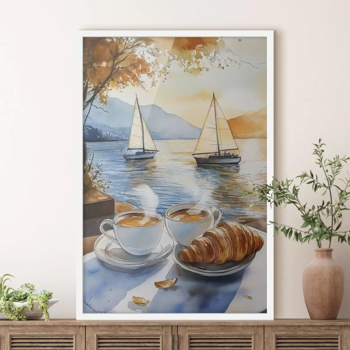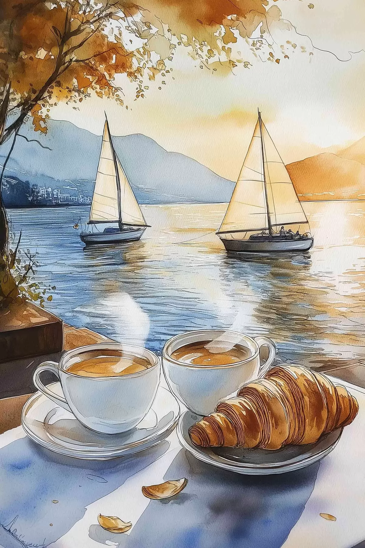Plakat Päikeseloojang järvel, purjekad, kohvitassid, akvarellistiilis f42442