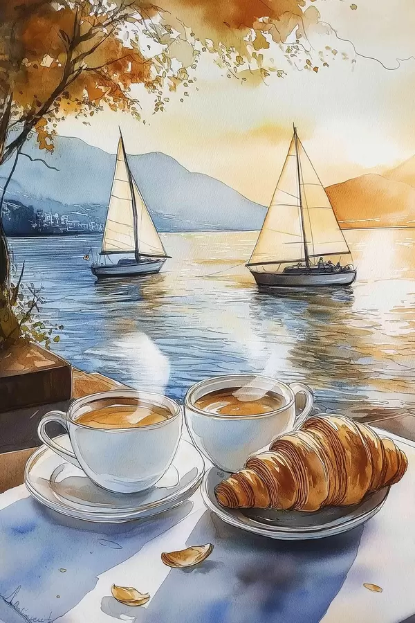Plakat Päikeseloojang järvel, purjekad, kohvitassid, akvarellistiilis f42442