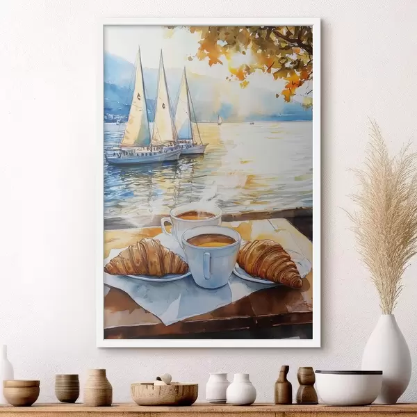 Poster Tass kohvi, päikeseloojangu värvid, järv, purjekad, loodus, reisimine Nr f42443