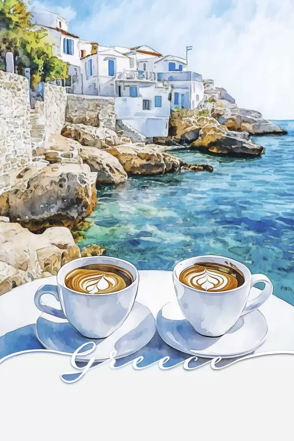 Poster Kreeka esteetika, kohvitassid, sinine meri, vanalinn, reisimine, reisimine Nr f42447