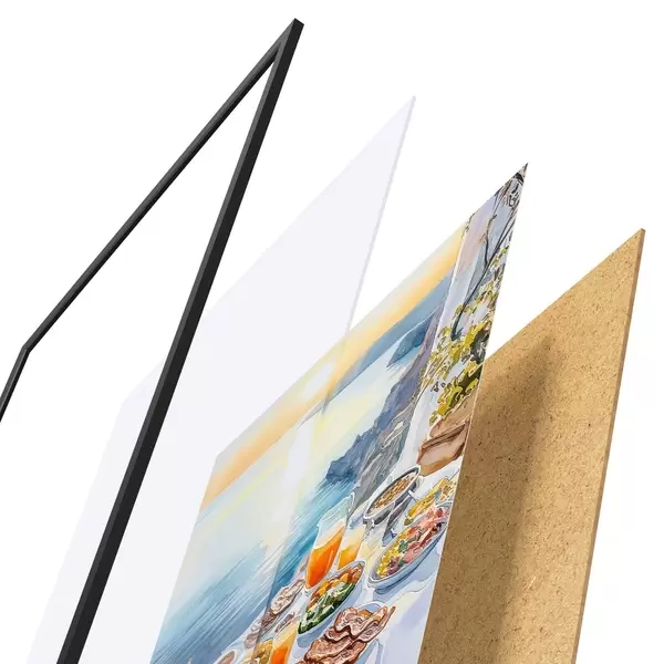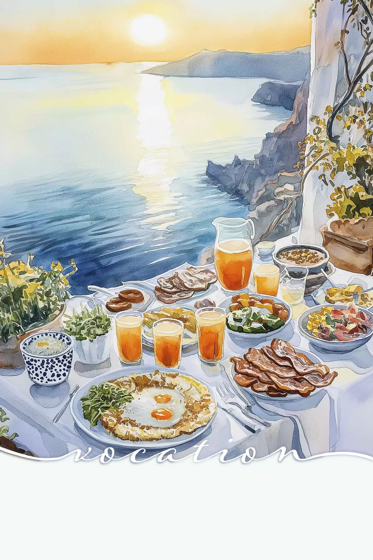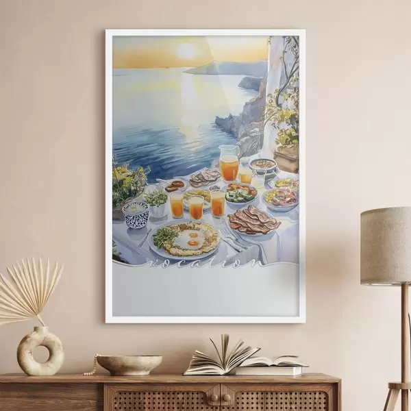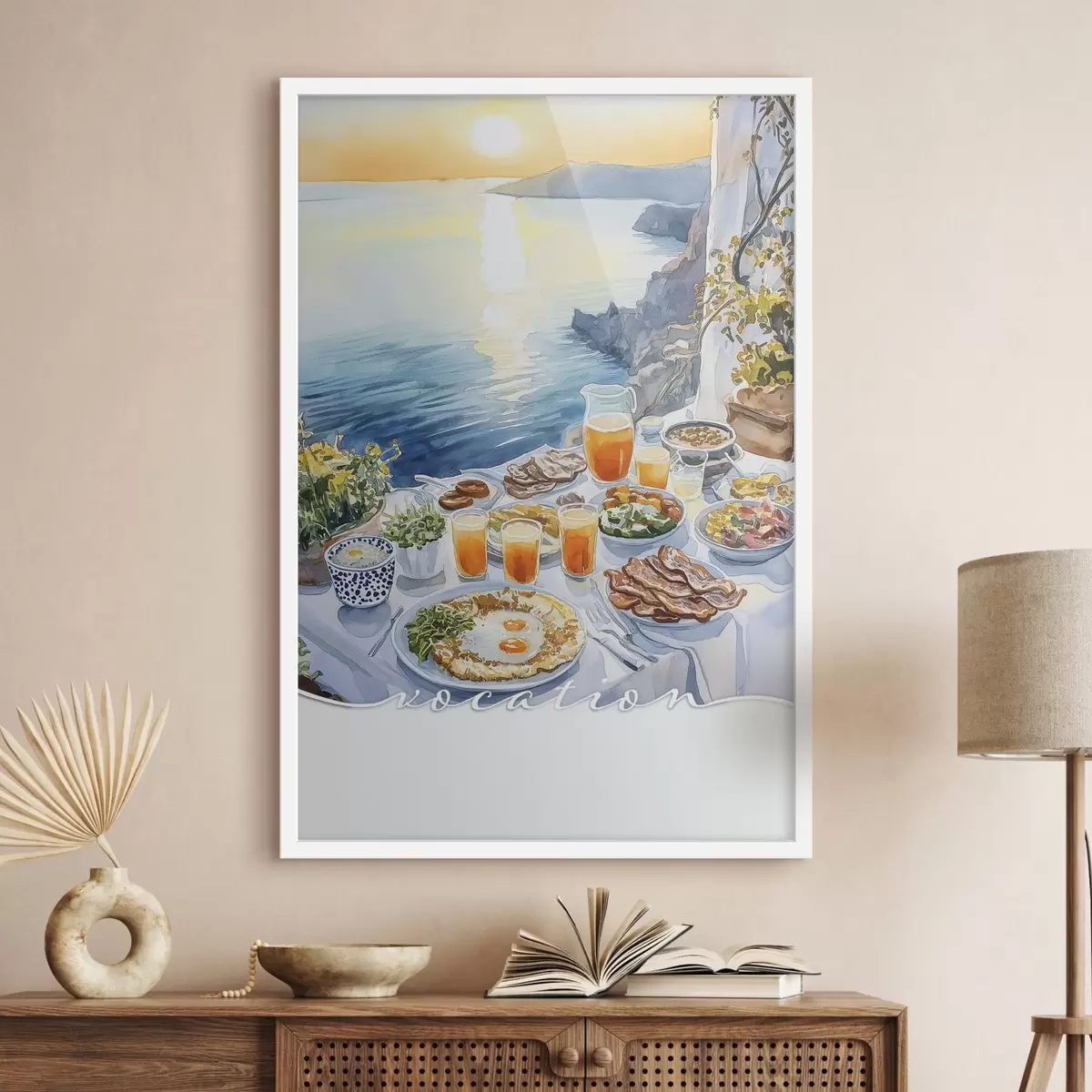 Poster Romantiline kutsumus Kreekas, akvarellstiilis, hommikusöök, päikesetõus Nr f42453