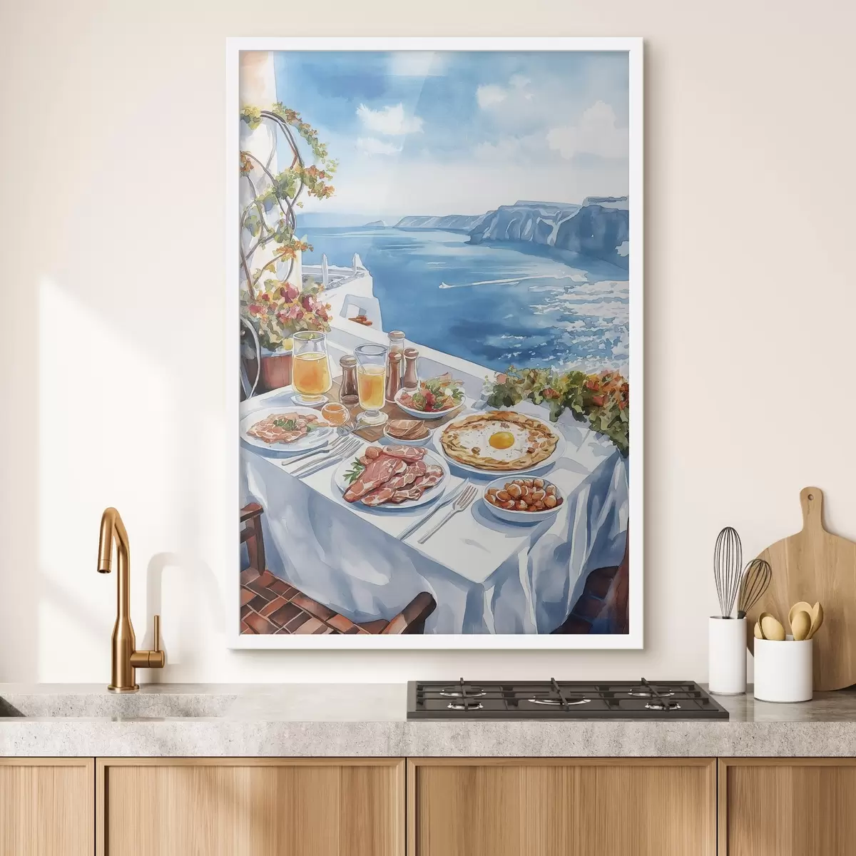 Poster Kaunis romantiline hommikusöök Kreekas, meri, akvarellistiilis Nr f42455